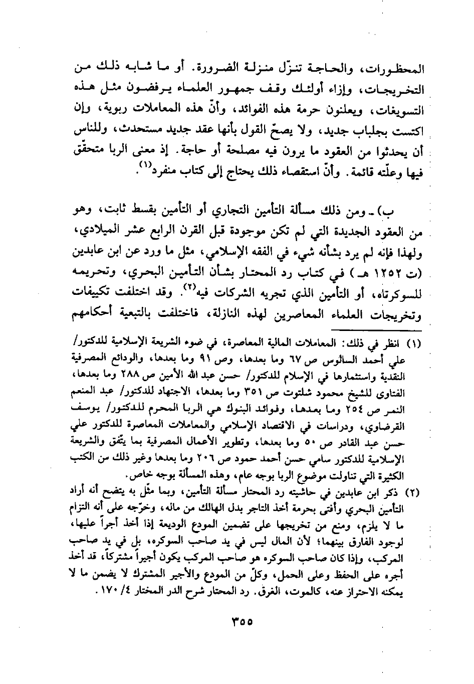 ب- ومن ذلك مسألة التأمين التجاري أو التأمين بقسط ثابت، وهو من العقود الجديدة التي لم تكن موجودة قبل القرن الرابع عشر الميلادي، ولهذا فإن لم يرد بشأنه شيء في الفقه الإسلامي، مثل ما ورد عن ابن عابدين (ت 1252هـ) في كتاب رد المحتار بشأن التأمين البحري، وتحريمه للسوكرتاه، أو التأمين الذي تجريه الشركات فيه (¬2). وقد اختلفت تكييفات وتخريجات العلماء المعاصرين لهذه النازلة، فاختلفت بالتبعية أحكامهم