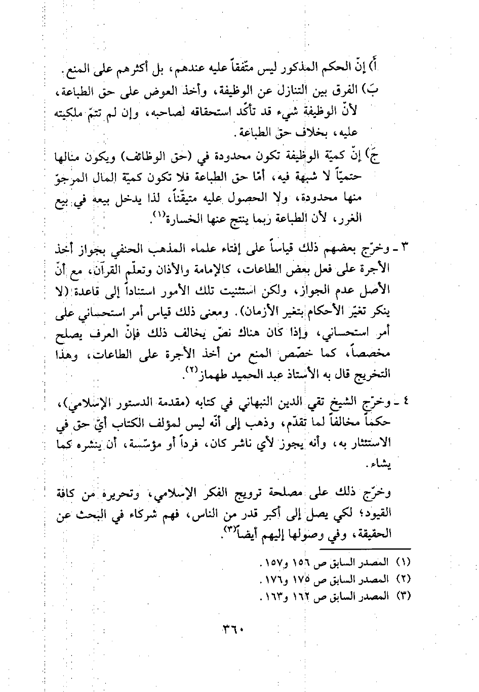 4 - وخرج الشيخ تقي الدين النبهاني في كتابه (مقدمة الدستور الإسلامي) حكماً مخالفاً لما تقدم، وذهب إلى أنه ليس لمؤلف الكتاب أي حق في الاستئثار به، وأنه يجوز لأي ناشر كان، فرداً أو مؤسسة، أن ينشره كما يشاء.