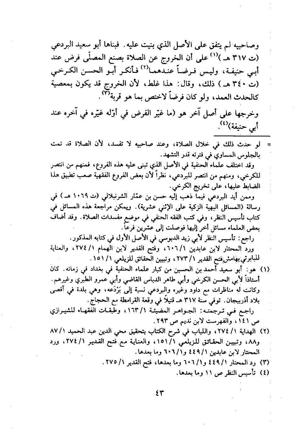 وصاحبيه لم يتفق على الأصل الذي بنيت عليه. فبناها أبو سعيد البردعي (ت 317هـ) (¬1) على أن الخروج عن الصلاة بصنع المصلى فرض عند أبي حنيفة، وليس فرضاً عندهما (¬2) فأنكر أبو الحسن الكرخي (ت 340هـ) ذلك، وقال: هذا غلط، لأن الخروج قد يكون بمعصية كالحدث العمد، ولو كان فرضاً لاختص بما هو قربة (¬3).