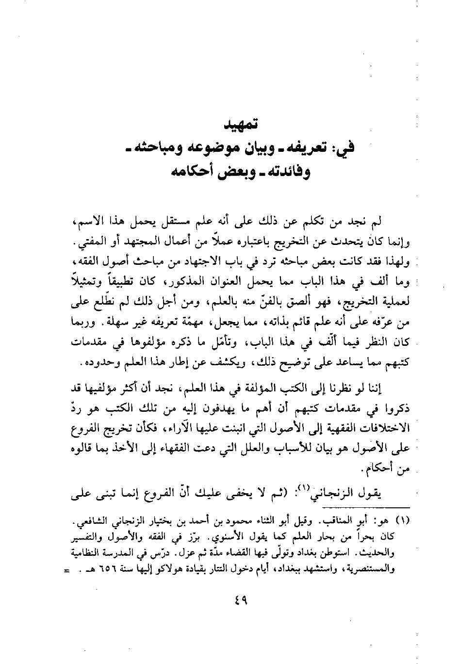 (¬1) هو: أبو المناقب. وقيل أبو الثناء محمود بن أحمد بن بختيار الزنجاني الشافعي. كان بحراً من بحار العلم كما يقول الأسنوي. برز في الفقه والأصول والتفسير والحديث. استوطن بغداد وتولى فيها القضاء مدة ثم عزل. درس في المدرسة النظامية والمستنصرية، واستشهد ببغداد، أيام دخول التتار بقيادة هولاكو إليها سنة 656هـ. ... =