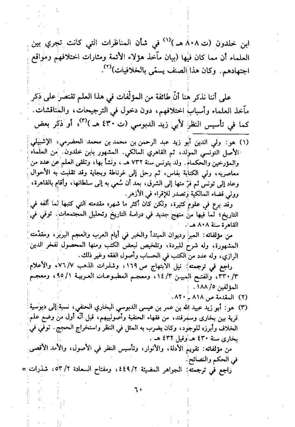 ابن خلدون (ت 808هـ) (¬1) في شأن المناظرات التي كانت تجري بين العلماء أن مما كان فيها (بيان مآخذ هؤلاء الأئمة ومثارات اختلافهم ومواقع اجتهادهم. وكان هذا الصنف يسمى بالخلافيات) (¬2).