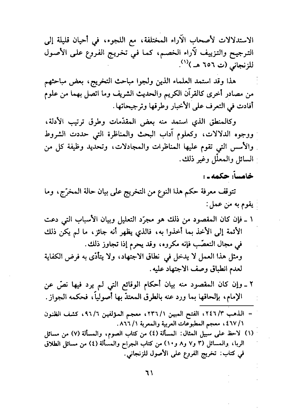 الاستدلالات لأصحاب الآراء المختلفة، مع اللجوء، في أحيان قليلة إلى الترجيح والتزييف لآراء الخصم، كما في تخريج الفروع على الأصول للزنجاني (ت656هـ) (¬1).