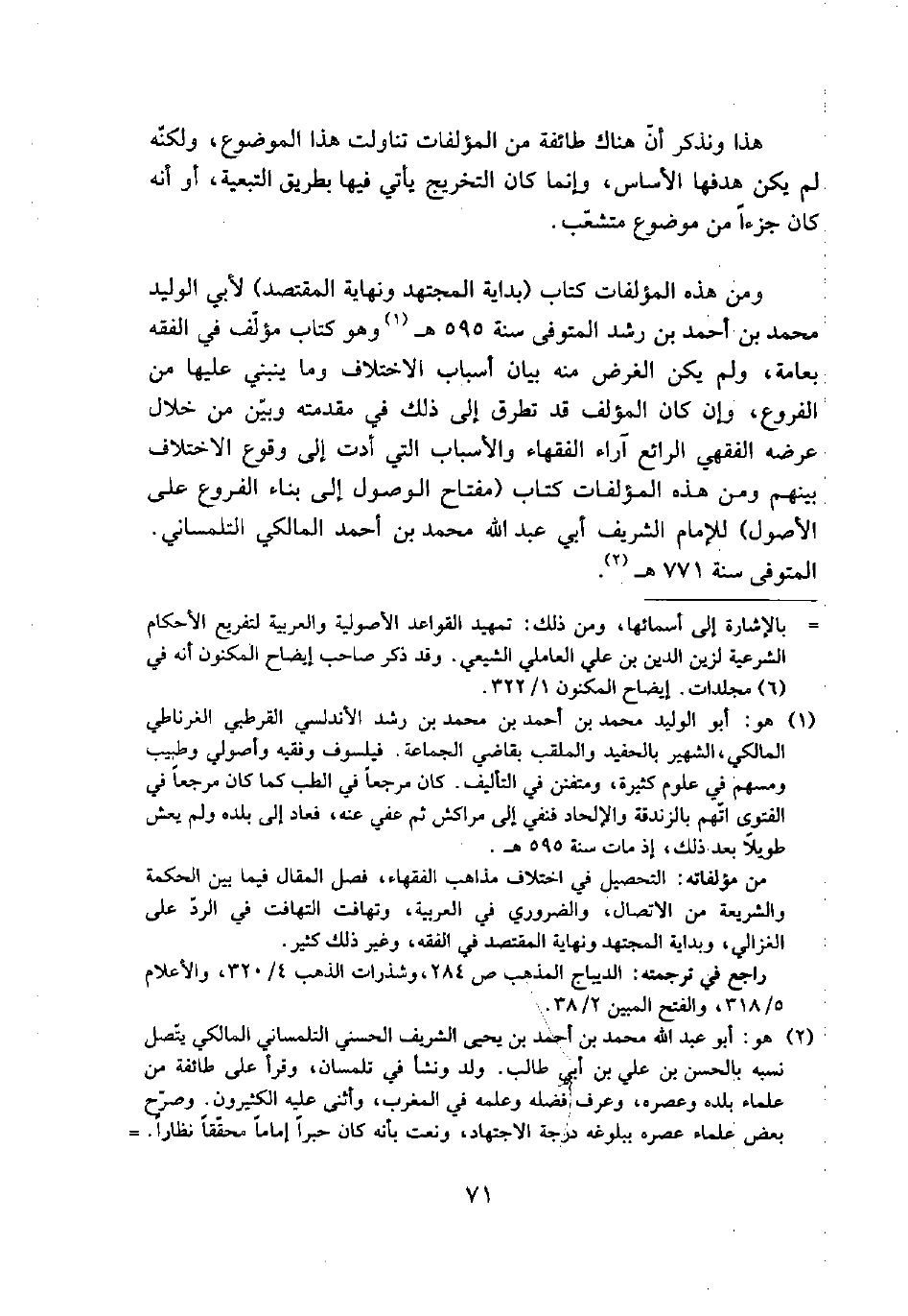 ومن هذه المؤلفات كتاب (بداية المجتهد ونهاية المقتصد) لأبي الوليد محمد بن أحمد بن رشد المتوفى سنة 595هـ (¬1) وهو كتاب مؤلف في الفقه بعامة، ولم يكن الغرض منه بيان أسباب الاختلاف وما ينبني عليها من الفروع، وإن كان المؤلف قد تطرق إلى ذلك في مقدمته وبين من خلال عرضه الفقهي الرائع آراء الفقهاء والأسباب التي أدت إلى وقوع الاختلاف بينهم ومن هذه المؤلفات كتاب (مفتاح الوصول إلى بناء الفروع على الأصول) للإمام اشريف أبي عبد الله محمد بن أحمد المالكي التلمساني المتوفى سنة 771هـ (¬2).