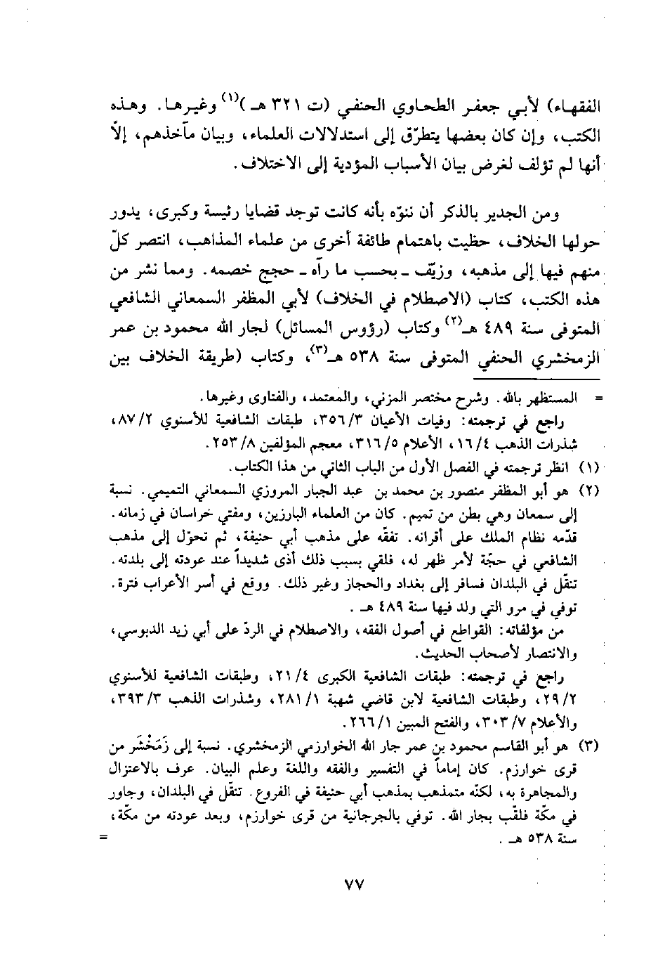 ومن الجدير بالذكر أن ننوه بأنه كانت توجد قضايا رئيسة وكبرى، يدور حولها الخلاف، حظيت باهتمام طائفة أخرى من علماء المذاهب، انتصر كل منهم فيها إلى مذهبه، وزيف – بحسب ما رآه – حجج خصمه. ومما نشر من هذه الكتب، كتاب (الاصطلام في الخلاف) لأبي المظفر السمعاني الشافعي المتوفى سنة 489هـ (¬2) وكتاب (رؤوس المسائل) لجار الله محمود بن عمر الزمخشري الحنفي المتوفى سنة 538هـ (¬3)، وكتاب (طريقة الخلاف بين
