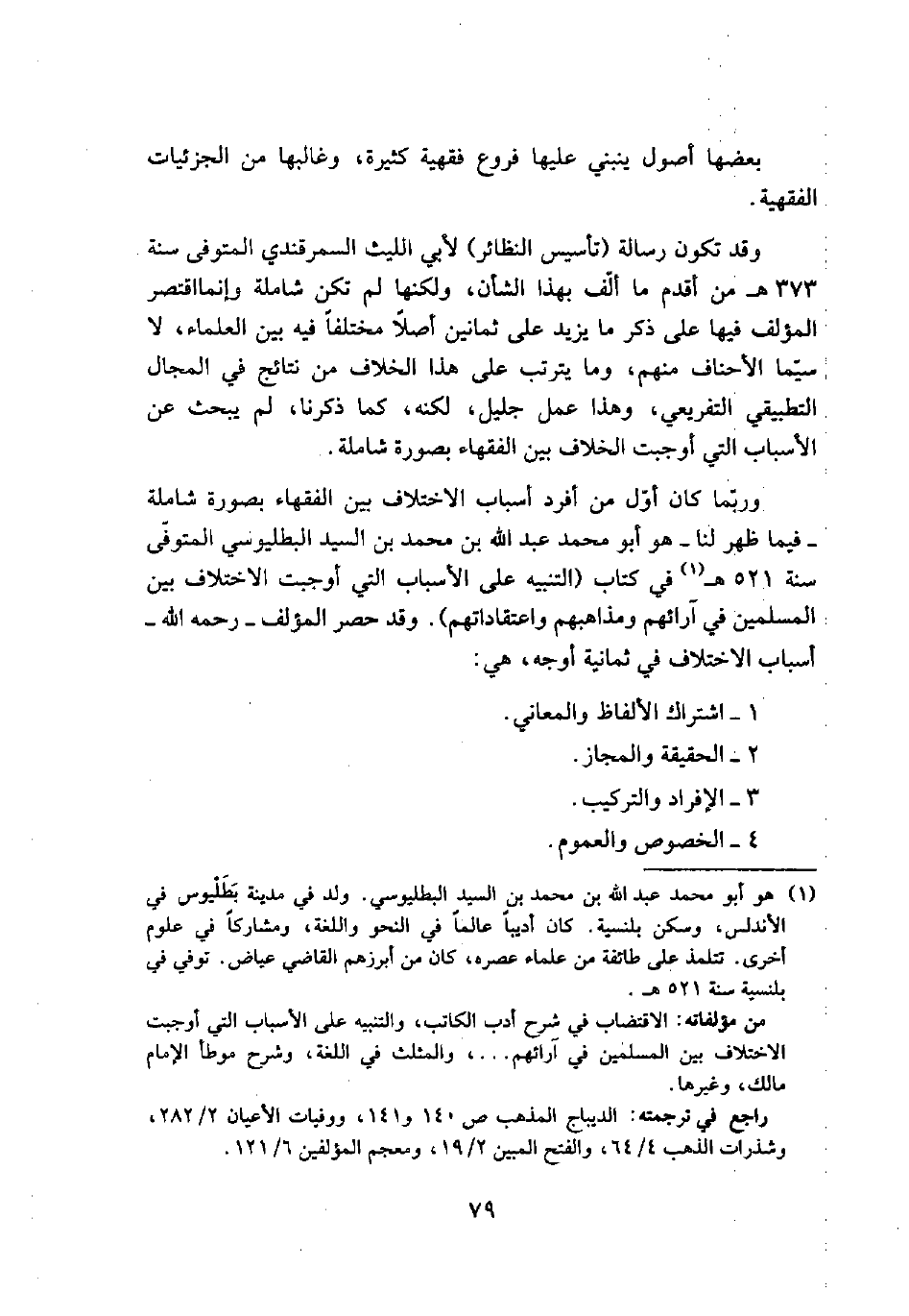 وربما كان أول من أفرد أسباب الاختلاف بين الفقهاء بصورة شاملة – فيما ظهر لنا – هو أبو محمد عبد الله بن محمد بن السيد البطليوسي المتوفى سنة 521هـ (¬1) في كتاب (التنبيه على الأسباب التي أوجبت الاختلاف بين المسلمين في آرائهم ومذاهبهم واعتقاداتهم). وقد حصر المؤلف – رحمه الله – أسباب الاختلاف في ثمانية أوجه، هي: