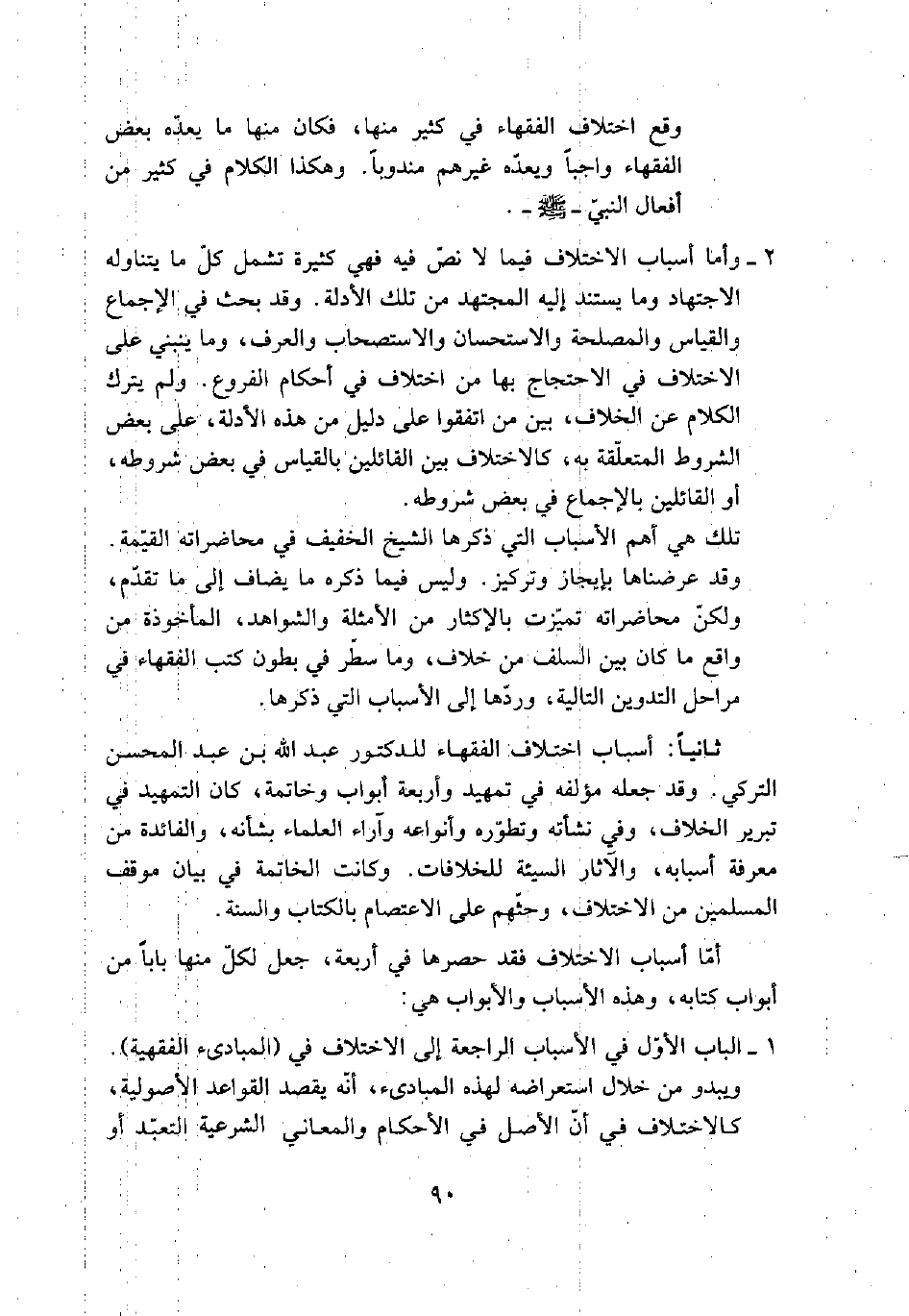 ثانيا: أسباب اختلاف الفقهاء للدكتور عبد الله بن عبد المحسن التركي. وقد جعله مؤلفه في تمهيد وأربعة أبواب وخاتمة، كان التمهيد في تبرير الخلاف، وفي نشأته وتطوره وأنواعه وآراء العلماء بشأنه، والفائدة من معرفة أسبابه، والآثار السيئة للخلافات. وكانت الخاتمة في بيان موقف المسلمين من الاختلاف، وحثهم على الاعتصام بالكتاب والسنة.