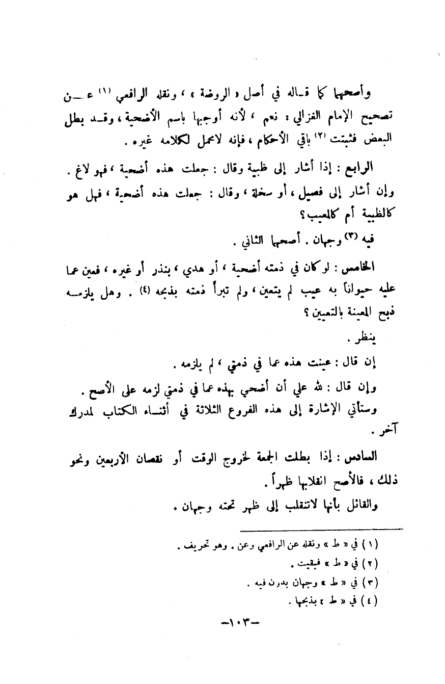 الرَّابِع إِذا أَشَارَ إِلَى ظَبْيَة وَقَالَ جعلت هَذِه أضْحِية فَهُوَ لاغ وَإِن أَشَارَ إِلَى فصيل أَو سخلة وَقَالَ جعلت هَذِه أضْحِية فَهَل هُوَ كالظبية أم كالمعيب