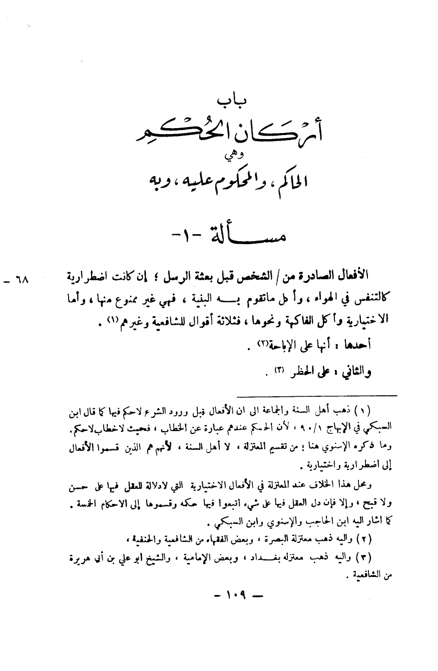 الْأَفْعَال الصادرة من الشَّخْص قبل بعثة الرُّسُل إِن كَانَت اضطرارية كالتنفس فِي الْهَوَاء وَأكل مَا تقوم بِهِ البنية فَهِيَ غير مَمْنُوع مِنْهَا وَأما الاختيارية وَأكل الْفَاكِهَة وَنَحْوهَا فَثَلَاثَة أَقْوَال للشَّافِعِيَّة وَغَيرهم