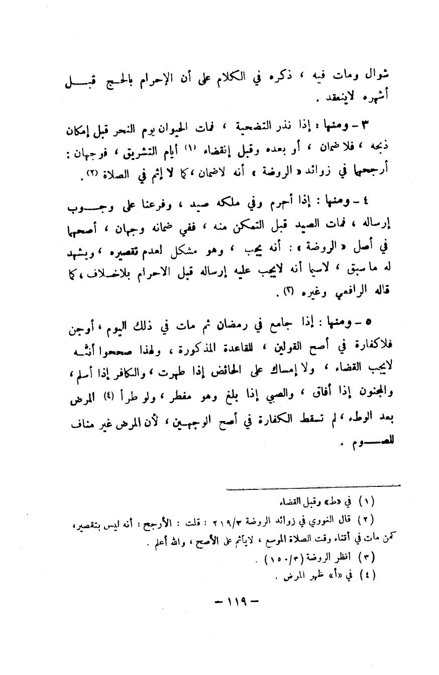3 - وَمِنْهَا إِذا نذر التَّضْحِيَة فَمَاتَ الْحَيَوَان يَوْم النَّحْر قبل إِمْكَان ذبحه فَلَا ضَمَان أَو بعده وَقبل إنقضاء أَيَّام التَّشْرِيق فَوَجْهَانِ أرجحهما فِي زَوَائِد الرَّوْضَة أَنه لَا ضَمَان كَمَا لَا إِثْم فِي الصَّلَاة