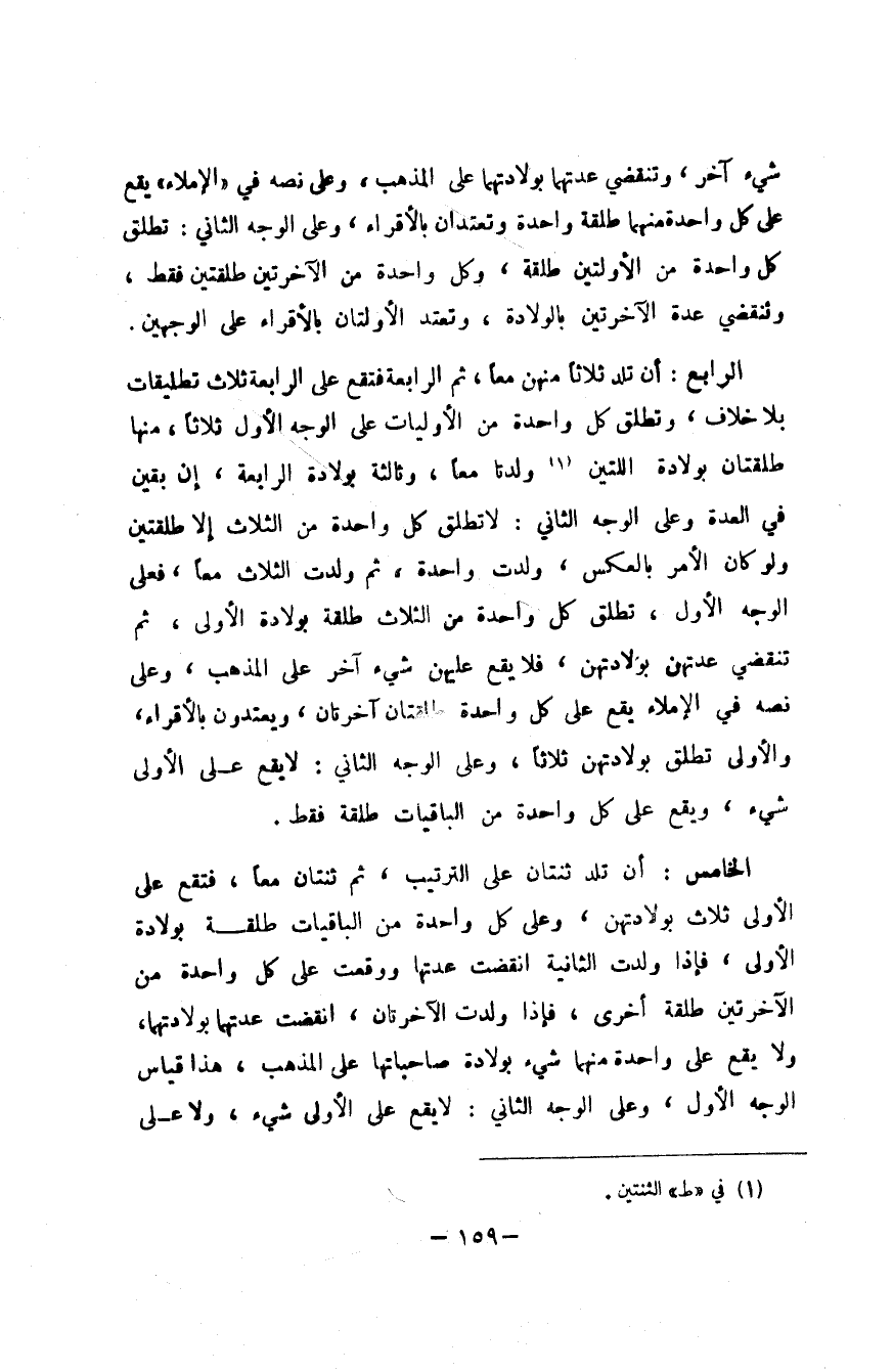 الْخَامِس أَن تَلد ثِنْتَانِ على التَّرْتِيب ثمَّ ثِنْتَانِ مَعًا فَتَقَع على الأولى ثَلَاث بولادتهن وعَلى كل وَاحِدَة من الْبَاقِيَات طَلْقَة بِوِلَادَة الأولى فَإِذا ولدت الثَّانِيَة انْقَضتْ عدتهَا وَوَقعت على كل وَاحِدَة من الآخرتين طَلْقَة أُخْرَى فَإِذا ولدت الآخرتان انْقَضتْ عدتهما بولادتهما وَلَا يَقع على وَاحِدَة مِنْهُمَا شَيْء بِوِلَادَة صاحباتها على الْمَذْهَب هَذَا قِيَاس الْوَجْه الأول وعَلى الْوَجْه الثَّانِي لَا يَقع على الأولى شَيْء وَلَا على