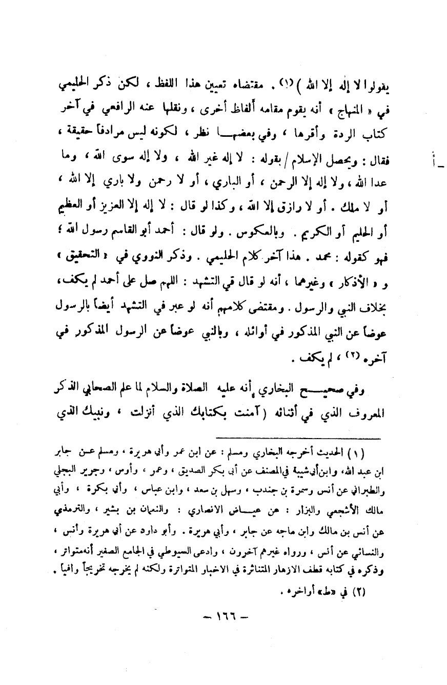 يَقُولُوا لَا إِلَه إِلَّا الله وَمُقْتَضَاهُ تعْيين هَذَا اللَّفْظ وَلَكِن ذكر الْحَلِيمِيّ فِي الْمِنْهَاج أَنه يقوم مقَامه أَلْفَاظ أُخْرَى ونقلها عَنهُ الرَّافِعِيّ فِي آخر كتاب الرِّدَّة وأقرها وَفِي بَعْضهَا نظر لكَونه لَيْسَ مرادفا حَقِيقَة فَقَالَ وَيحصل الْإِسْلَام بقوله لَا إِلَه غير الله وَلَا إِلَه سوى الله وَمَا عدا الله وَلَا إِلَه إِلَّا الرَّحْمَن أَو الْبَارِي أَو لَا رَحْمَن وَلَا باري إِلَّا الله أَو لَا ملك أَو لَا رَازِق إِلَّا الله وَكَذَا لَو قَالَ لَا إِلَه إِلَّا الْعَزِيز أَو الْعَظِيم أَو الْحَلِيم أَو الْكَرِيم وبالعكوس وَلَو قَالَ أَحْمد أَبُو الْقَاسِم رَسُول الله فَهُوَ كَقَوْلِه مُحَمَّد هَذَا آخر كَلَام الْحَلِيمِيّ وَذكر النَّوَوِيّ فِي التَّحْقِيق والأذكار وَغَيرهمَا أَنه لَو قَالَ فِي التَّشَهُّد اللَّهُمَّ صل على أَحْمد لم يكف بِخِلَاف النَّبِي وَالرَّسُول وَمُقْتَضى كَلَامهم أَنه لَو عبر فِي التَّشَهُّد أَيْضا بالرسول عوضا عَن النَّبِي الْمَذْكُور فِي أَوَائِله وبالنبي عوضا عَن الرَّسُول الْمَذْكُور فِي آخِره لم يكف