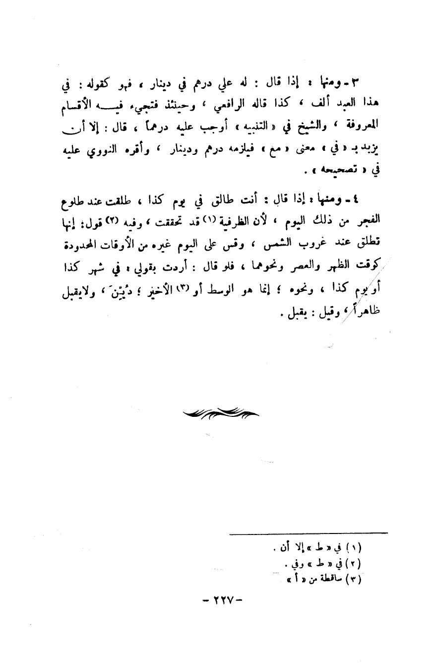 3 - وَمِنْهَا إِذا قَالَ لَهُ عَليّ دِرْهَم فِي دِينَار فَهُوَ كَقَوْلِه فِي هَذَا العَبْد ألف كَذَا قَالَه الرَّافِعِيّ وَحِينَئِذٍ فتجيء فِيهِ الْأَقْسَام الْمَعْرُوفَة وَالشَّيْخ فِي التَّنْبِيه أوجب عَلَيْهِ درهما قَالَ إِلَّا أَن يزِيد ب فِي معنى مَعَ فَيلْزمهُ دِرْهَم ودينار وَأقرهُ النَّوَوِيّ عَلَيْهِ فِي تَصْحِيحه 4 وَمِنْهَا إِذا قَالَ أَنْت طَالِق فِي يَوْم كَذَا طلقت عِنْد طُلُوع الْفجْر من ذَلِك الْيَوْم لِأَن الظَّرْفِيَّة قد تحققت وَفِيه قَول إِنَّهَا تطلق عِنْد غرُوب الشَّمْس وَقس على الْيَوْم غَيره من الْأَوْقَات المحدودة كوقت الظّهْر وَالْعصر وَنَحْوهمَا فَلَو قَالَ أردْت بِقَوْلِي فِي شهر كَذَا أَو يَوْم كَذَا وَنَحْوه إِنَّمَا هُوَ الْوسط أَو الْأَخير دين وَلَا يقبل ظَاهرا وَقيل يقبل