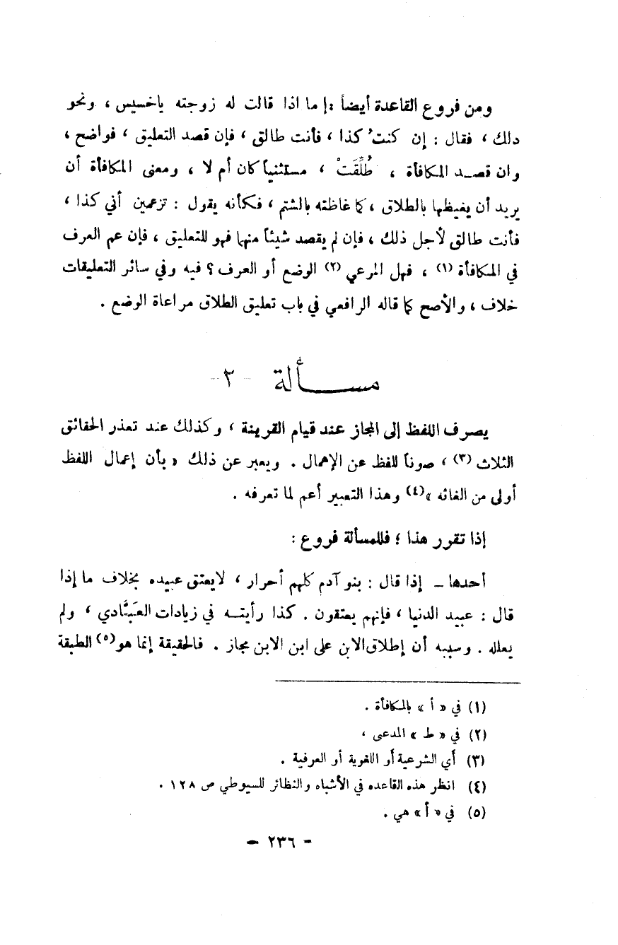 وَمن فروع الْقَاعِدَة أَيْضا مَا اذا قَالَت لَهُ زَوجته يَا خسيس وَنَحْو ذَلِك فَقَالَ إِن كنت كَذَا فَأَنت طَالِق فَإِن قصد التَّعْلِيق فَوَاضِح وان قصد الْمُكَافَأَة طلقت مستثنيا كَانَ أم لَا وَمعنى الْمُكَافَأَة أَن يُرِيد أَن يغيظها بِالطَّلَاق كَمَا غاظته بالشتم فَكَأَنَّهُ يَقُول تزعمين أَنِّي كَذَا فَأَنت طَالِق لأجل ذَلِك فَإِن لم يقْصد شَيْئا مِنْهُمَا فَهُوَ للتعليق فَإِن عَم الْعرف فِي الْمُكَافَأَة فَهَل المرعي الْوَضع أَو الْعرف فِيهِ وَفِي سَائِر التعليقات خلاف وَالأَصَح كَمَا قَالَه الرَّافِعِيّ فِي بَاب تَعْلِيق الطَّلَاق مُرَاعَاة الْوَضع