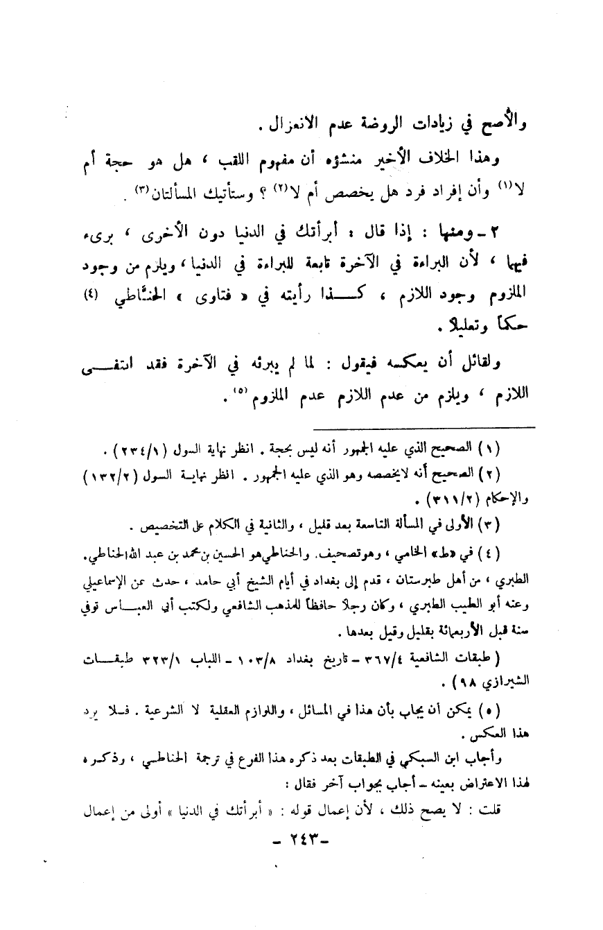 2 - وَمِنْهَا إِذا قَالَ أَبْرَأتك فِي الدُّنْيَا دون الْأُخْرَى برىء فيهمَا لِأَن الْبَرَاءَة فِي الْآخِرَة تَابِعَة للبراءة فِي الدُّنْيَا وَيلْزم من وجود الْمَلْزُوم وجود اللَّازِم كَذَا رَأَيْته فِي فَتَاوَى الحناطي حكما وتعليلا
