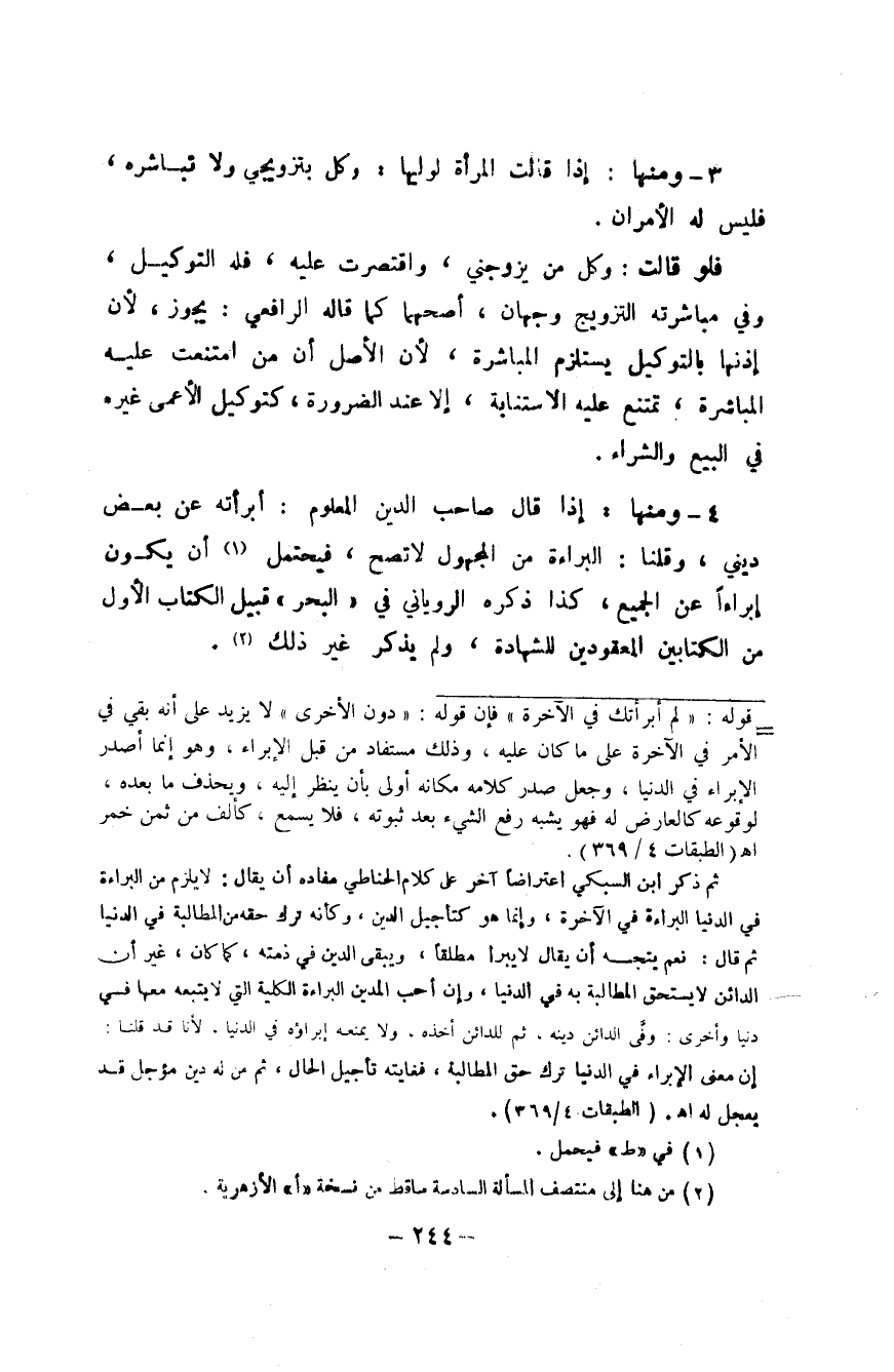 4 - وَمِنْهَا إِذا قَالَ صَاحب الدّين الْمَعْلُوم أَبرَأته عَن بعض ديني وَقُلْنَا الْبَرَاءَة من الْمَجْهُول لَا تصح فَيحْتَمل أَن يكون إبراءا عَن الْجَمِيع كَذَا ذكره الرَّوْيَانِيّ فِي الْبَحْر قبيل الْكتاب الأول من الْكِتَابَيْنِ المعقودين للشَّهَادَة وَلم يذكر غير ذَلِك