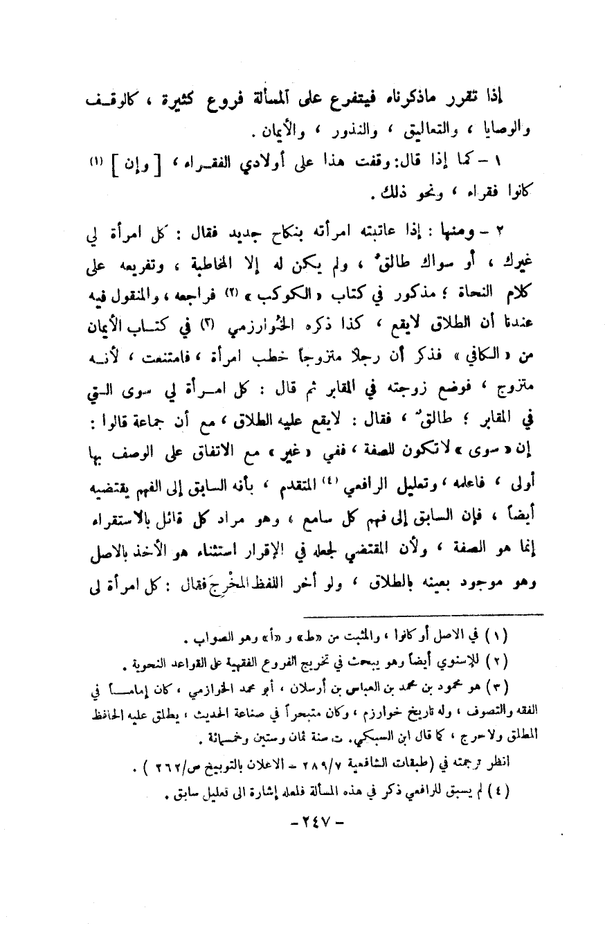 2 - وَمِنْهَا إِذا عاتبته امْرَأَته بِنِكَاح جَدِيد فَقَالَ كل امْرَأَة لي غَيْرك أَو سواك طَالِق وَلم يكن لَهُ إِلَّا المخاطبة وتفريعه على كَلَام النُّحَاة مَذْكُور فِي كتاب الْكَوْكَب فَرَاجعه وَالْمَنْقُول فِيهِ عندنَا أَن الطَّلَاق لَا يَقع كَذَا ذكره الْخَوَارِزْمِيّ فِي كتاب الْأَيْمَان من الْكَافِي فَذكر أَن رجلا متزوجا خطب امْرَأَة فامتنعت لِأَنَّهُ متزوج فَوضع زَوجته فِي الْمَقَابِر ثمَّ قَالَ كل امْرَأَة لي سوى الَّتِي فِي الْمَقَابِر طَالِق فَقَالَ لَا يَقع عَلَيْهِ الطَّلَاق مَعَ أَن جمَاعَة قَالُوا إِن سوى لَا تكون للصفة فَفِي غير مَعَ الِاتِّفَاق على الْوَصْف بهَا أولى فاعلمه وتعليل الرَّافِعِيّ الْمُتَقَدّم بِأَنَّهُ السَّابِق إِلَى الْفَهم يَقْتَضِيهِ أَيْضا فَإِن السَّابِق إِلَى فهم كل سامع وَهُوَ مُرَاد كل قَائِل بالاستقراء إِنَّمَا هُوَ الصّفة وَلِأَن الْمُقْتَضِي لجعله فِي الْإِقْرَار اسْتثِْنَاء هُوَ الْأَخْذ بالاصل وَهُوَ مَوْجُود بِعَيْنِه بِالطَّلَاق وَلَو أخر اللَّفْظ الْمخْرج فَقَالَ كل امْرَأَة لى