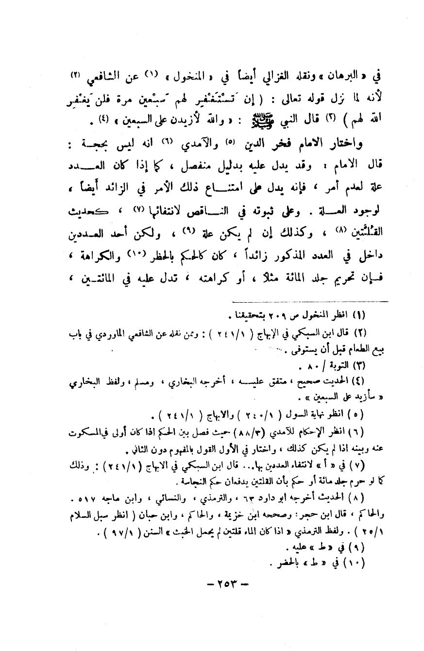 فِي الْبُرْهَان وَنَقله الْغَزالِيّ أَيْضا فِي المنخول عَن الشَّافِعِي لِأَنَّهُ لما نزل قَوْله تَعَالَى {إِن تستغفر لَهُم سبعين مرّة فَلَنْ يغْفر الله لَهُم} قَالَ النَّبِي صلى الله عَلَيْهِ وَسلم وَالله لأزيدن على السّبْعين