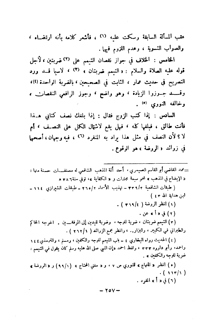 الْخَامِس الْخلاف فِي جَوَاز نُقْصَان التَّيَمُّم على ضربتين لأجل قَوْله عَلَيْهِ الصَّلَاة وَالسَّلَام وَالتَّيَمُّم ضربتان لَا سِيمَا قد ورد التَّصْرِيح فِي حَدِيث عمار الثَّابِت فِي الصَّحِيحَيْنِ بالضربة الْوَاحِدَة وَقد جوزوا الزِّيَادَة وَهُوَ وَاضح وَجوز الرَّافِعِيّ النُّقْصَان وَخَالفهُ النَّوَوِيّ