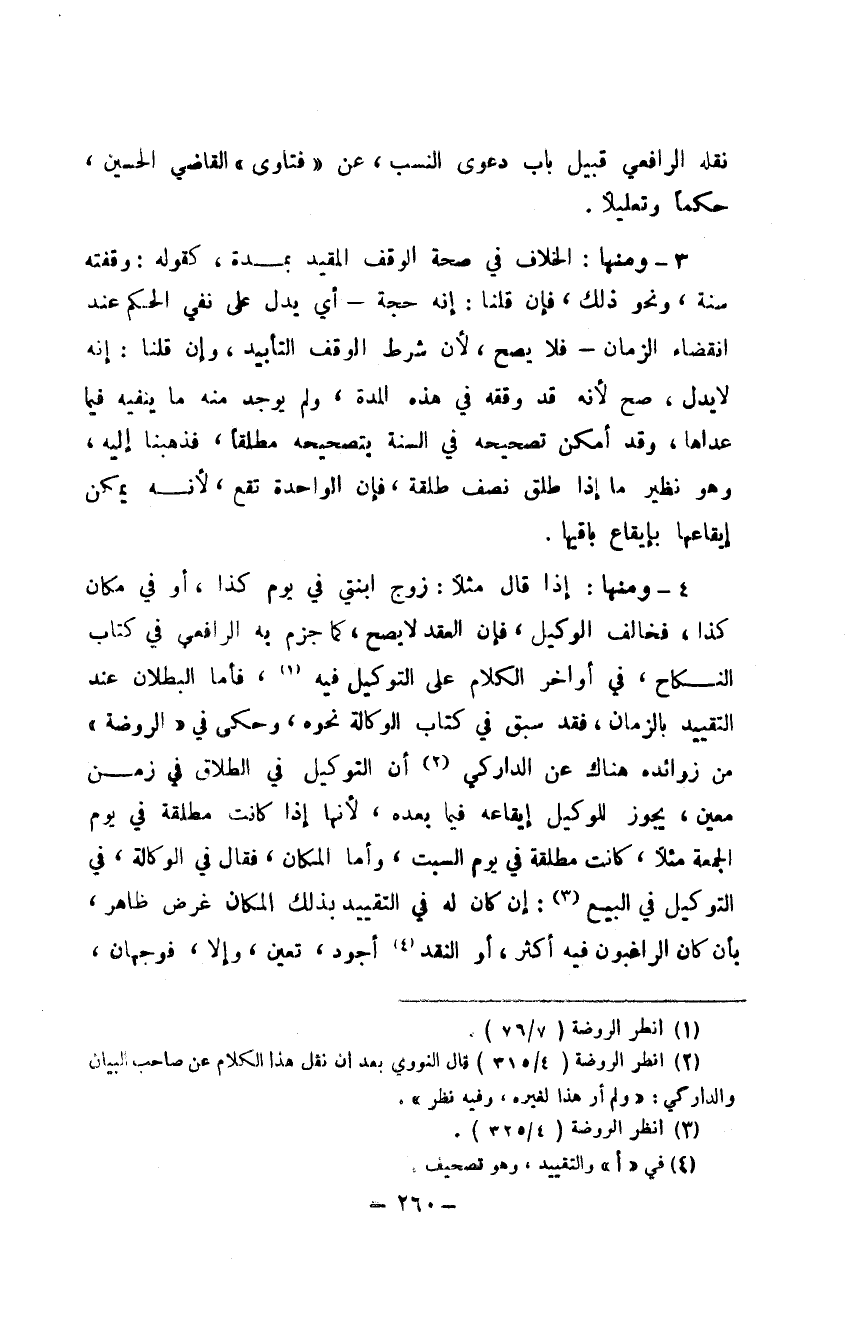 4 - وَمِنْهَا إِذا قَالَ مثلا زوج ابْنَتي فِي يَوْم كَذَا أَو فِي مَكَان كَذَا فَخَالف الْوَكِيل فَإِن العقد لَا يَصح كَمَا جزم بِهِ الرَّافِعِيّ فِي كتاب النِّكَاح فِي اواخر الْكَلَام على التَّوْكِيل فِيهِ فَأَما الْبطلَان عِنْد التَّقْيِيد بِالزَّمَانِ فقد سبق فِي كتاب الْوكَالَة نَحوه وَحكى فِي الرَّوْضَة من زوائده هُنَاكَ عَن الداركي أَن التَّوْكِيل فِي الطَّلَاق فِي زمن معِين يجوز للْوَكِيل إِيقَاعه فِيمَا بعده لِأَنَّهَا إِذا كَانَت مُطلقَة فِي يَوْم الْجُمُعَة مثلا كَانَت مُطلقَة فِي يَوْم السبت وَأما الْمَكَان فَقَالَ فِي الْوكَالَة فِي التَّوْكِيل فِي البيع إِن كَانَ لَهُ فِي التَّقْيِيد بذلك الْمَكَان غَرَض ظَاهر بِأَن كَانَ الراغبون فِيهِ أَكثر أَو النَّقْد اجود تعين وَإِلَّا فَوَجْهَانِ