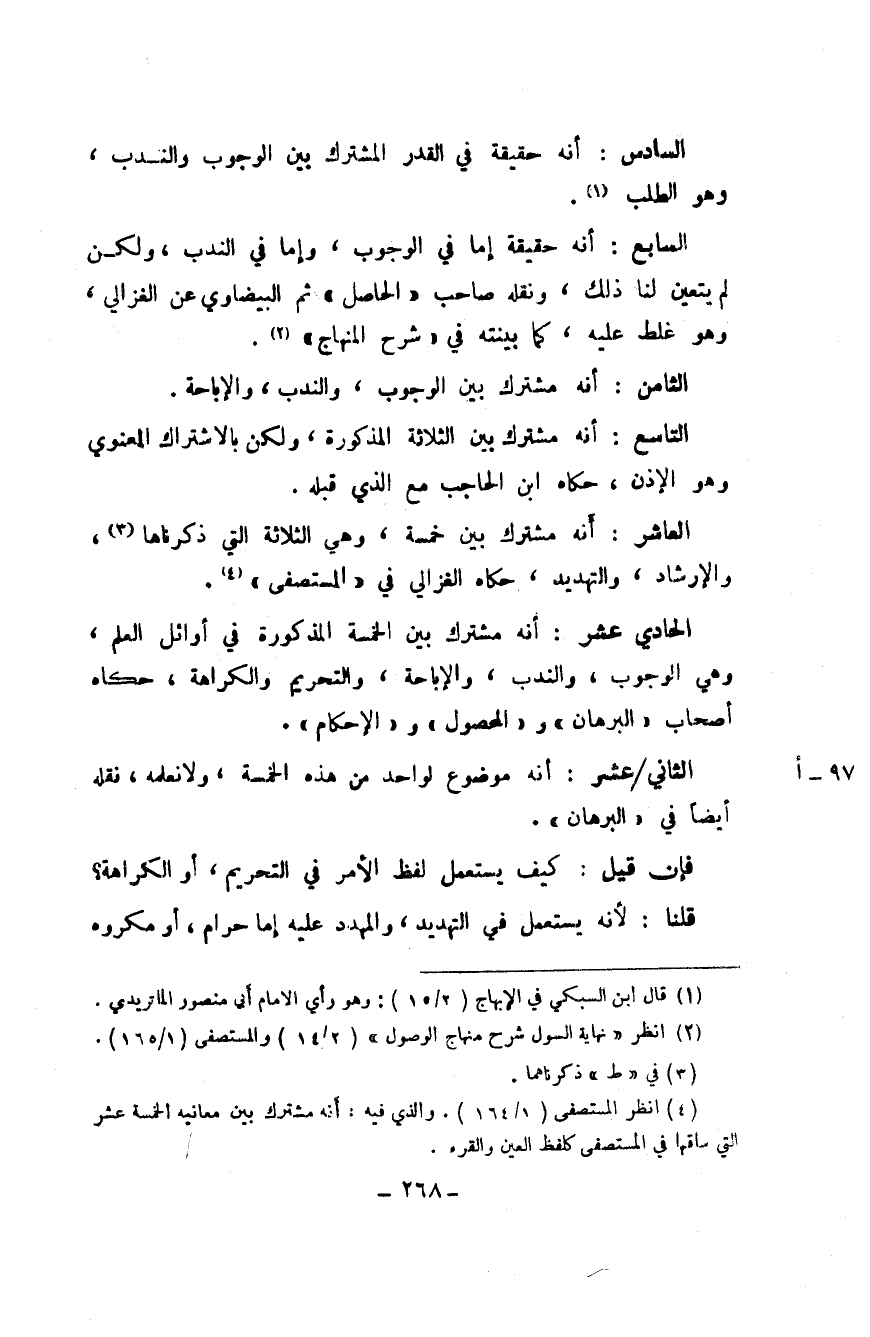 الْعَاشِر أَنه مُشْتَرك بَين خَمْسَة وَهِي الثَّلَاثَة الَّتِي ذَكرنَاهَا والإرشاد والتهديد حَكَاهُ الْغَزالِيّ فِي الْمُسْتَصْفى