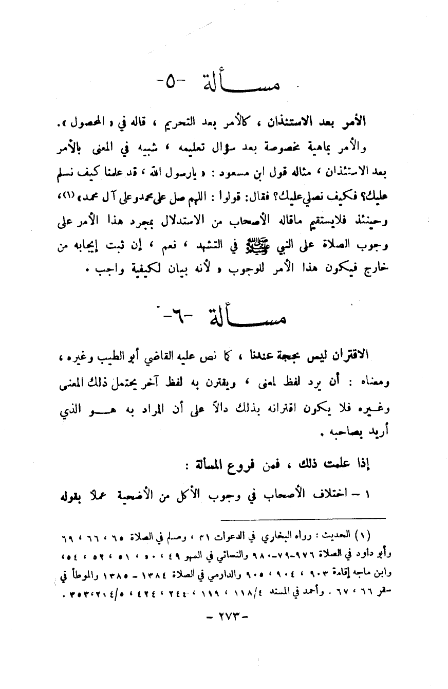 الْأَمر بعد الإستئذان كالأمر بعد التَّحْرِيم قَالَه فِي الْمَحْصُول وَالْأَمر بماهية مَخْصُوصَة بعد سُؤال تَعْلِيمه شَبيه فِي الْمَعْنى بِالْأَمر بعد الإستئذان مِثَاله قَول ابْن مَسْعُود يَا رَسُول الله قد علمنَا كَيفَ نسلم عَلَيْك فَكيف نصلي عَلَيْك فَقَالَ قُولُوا اللَّهُمَّ صل على مُحَمَّد وعَلى آل مُحَمَّد وَحِينَئِذٍ فَلَا يَسْتَقِيم مَا قَالَه الْأَصْحَاب من الِاسْتِدْلَال بِمُجَرَّد هَذَا الْأَمر على وجوب الصَّلَاة على النَّبِي صلى الله عَلَيْهِ وَسلم فِي التَّشَهُّد نعم إِن ثَبت إِيجَابه من خَارج فَيكون هَذَا الْأَمر للْوُجُوب لِأَنَّهُ بَيَان لكيفية وَاجِب