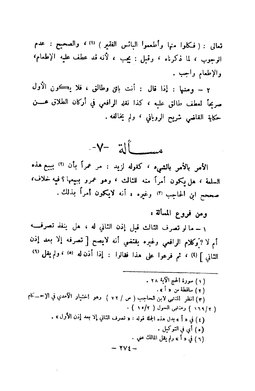 الْأَمر بِالْأَمر بالشَّيْء كَقَوْلِه لزيد مر عمرا بِأَن يَبِيع هَذِه السّلْعَة هَل يكون أمرا مِنْهُ للثَّالِث وَهُوَ عَمْرو بِبَيْعِهَا فِيهِ خلاف صحح ابْن الْحَاجِب وَغَيره أَنه لَا يكون أمرا بذلك