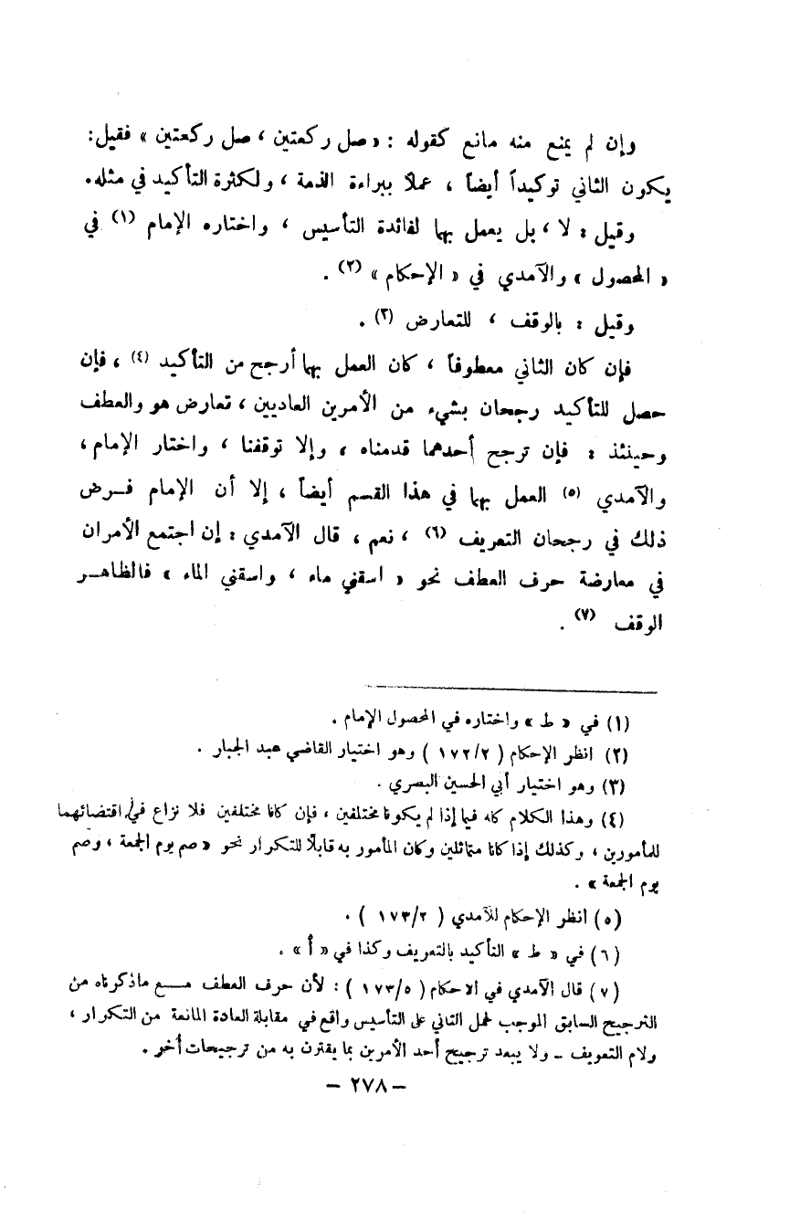 وَإِن لم يمْنَع مِنْهُ مَانع كَقَوْلِه صل رَكْعَتَيْنِ صل رَكْعَتَيْنِ فَقيل يكون الثَّانِي توكيدا أَيْضا عملا بِبَرَاءَة الذِّمَّة ولكثرة التَّأْكِيد فِي مثله وَقيل لَا بل يعْمل بهما لفائدة التأسيس وَاخْتَارَهُ الإِمَام فِي الْمَحْصُول والآمدي فِي الإحكام