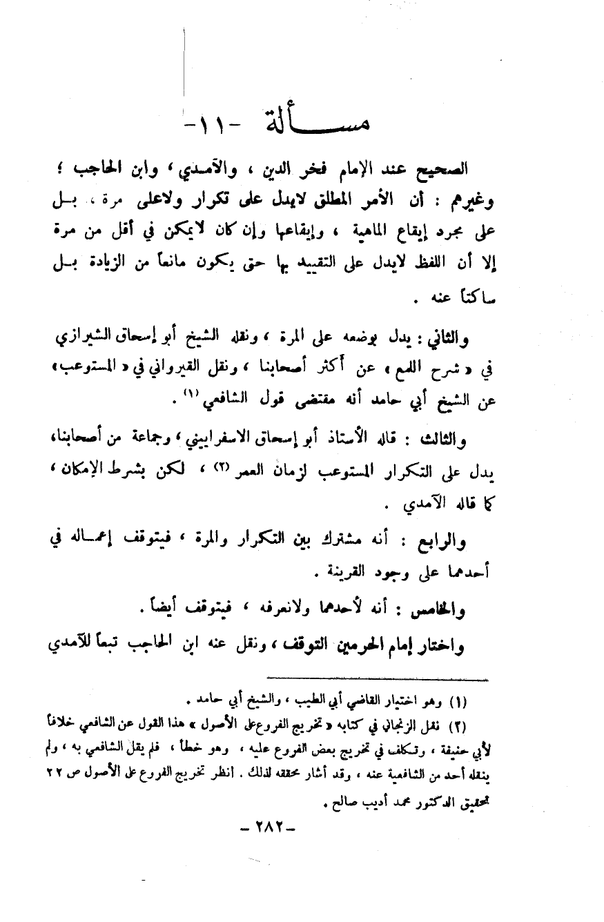 الصَّحِيح عِنْد الإِمَام فَخر الدّين والآمدي وَابْن الْحَاجِب وَغَيرهم أَن الْأَمر الْمُطلق لَا يدل على تكْرَار وَلَا على مرّة بل على مُجَرّد إِيقَاع الْمَاهِيّة وإيقاعها وَإِن كَانَ لَا يُمكن فِي اقل من مرّة إِلَّا أَن اللَّفْظ لَا يدل على التَّقْيِيد بهَا حَتَّى يكون مَانِعا من الزِّيَادَة بل ساكتا عَنهُ