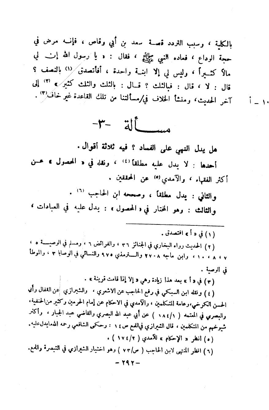 بِالْكُلِّيَّةِ وَسبب التَّرَدُّد قصَّة سعد بن أبي وَقاص فَإِنَّهُ مرض فِي حجَّة الْوَدَاع فعاده النَّبِي صلى الله عَلَيْهِ وَسلم فَقَالَ يَا رَسُول الله إِن لي مَالا كثيرا وَلَيْسَ لي إِلَّا ابْنة وَاحِدَة أفأتصدق بِالنِّصْفِ قَالَ لَا قَالَ فبالثلث قَالَ بِالثُّلثِ وَالثلث كثير إِلَى آخر الحَدِيث ومنشأ الْخلاف فِي مَسْأَلَتنَا من تِلْكَ الْقَاعِدَة غير خَافَ