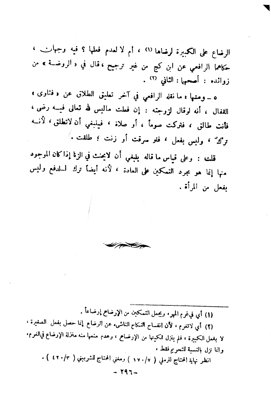 الرَّضَاع على الْكَبِيرَة لرضاها أم لَا لعدم فعلهَا فِيهِ وَجْهَان حَكَاهُمَا الرَّافِعِيّ عَن ابْن كج من غير تَرْجِيح قَالَ فِي الرَّوْضَة من زوائده اصحهما الثَّانِي