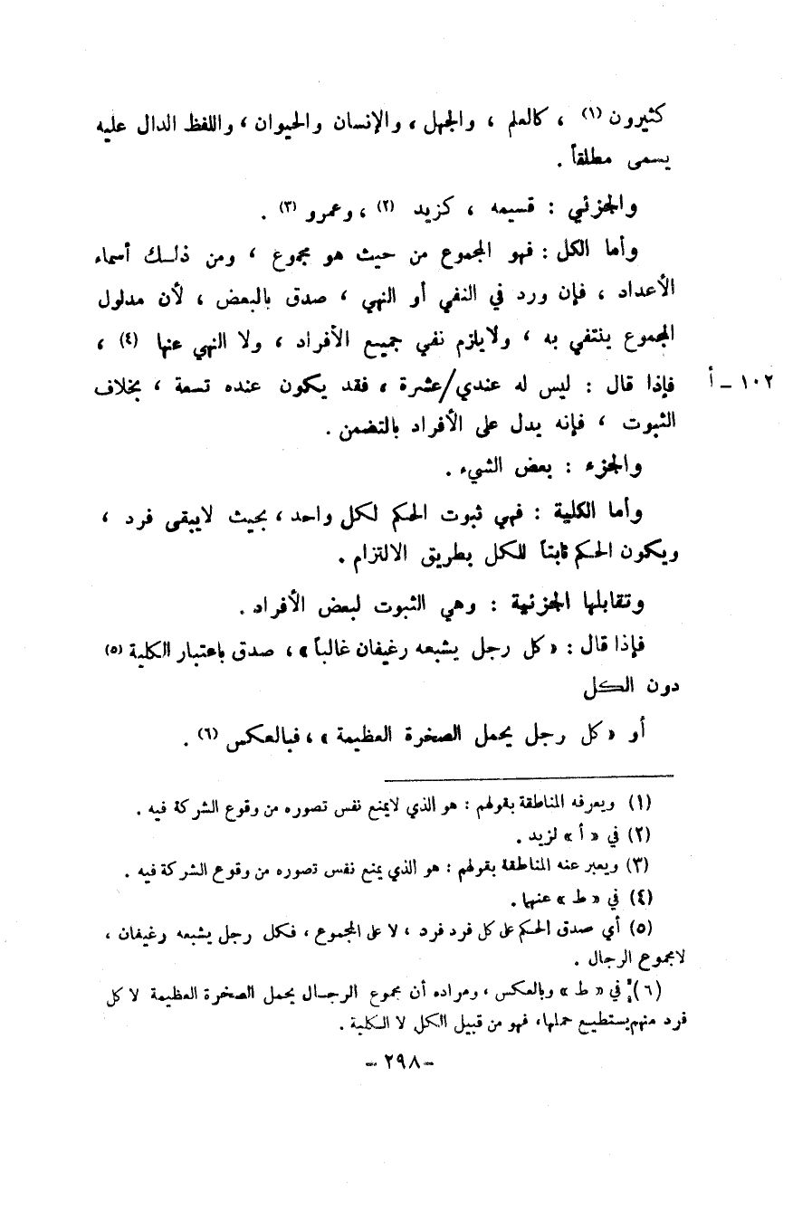 وتقابلها الْجُزْئِيَّة وَهِي الثُّبُوت لبَعض الْأَفْرَاد فَإِذا قَالَ كل رجل ليشبعه رغيفان غَالِبا صدق بِاعْتِبَار الْكُلية دون الْكل