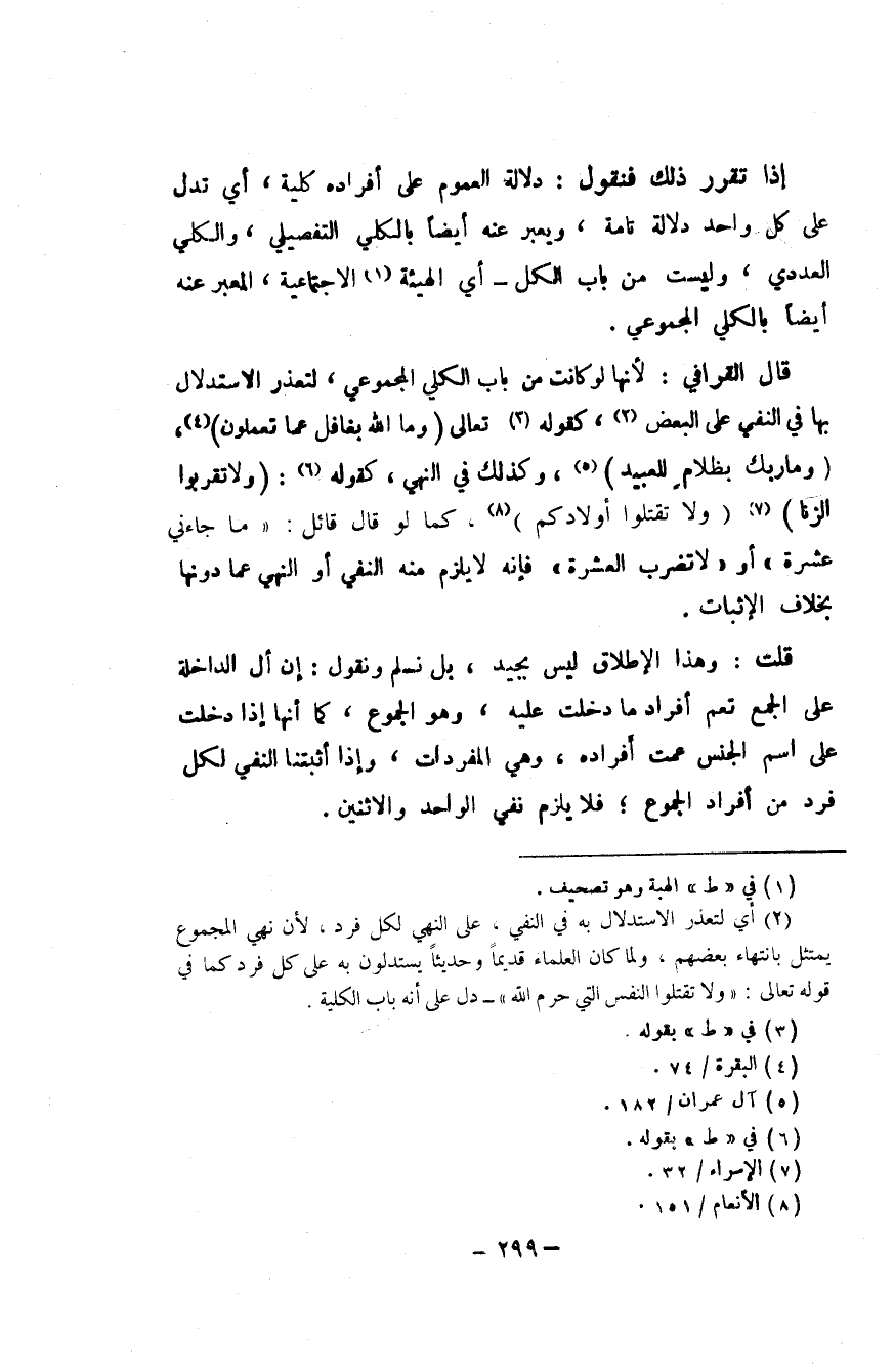 قَالَ الْقَرَافِيّ لِأَنَّهَا لَو كَانَت من بَاب الْكُلِّي المجموعي لتعذر الِاسْتِدْلَال بهَا فِي النَّفْي على الْبَعْض كَقَوْلِه تَعَالَى {وَمَا الله بغافل عَمَّا تَعْمَلُونَ} {وَمَا رَبك بظلام للعبيد} وَكَذَلِكَ فِي النَّهْي كَقَوْلِه {وَلَا تقربُوا الزِّنَى} {وَلَا تقتلُوا أَوْلَادكُم} كَمَا لَو قَالَ قَائِل مَا جَاءَنِي عشرَة أَو لَا تضرب الْعشْرَة فَإِنَّهُ لَا يلْزم مِنْهُ النَّفْي أَو النَّهْي عَمَّا دونهَا بِخِلَاف الْإِثْبَات