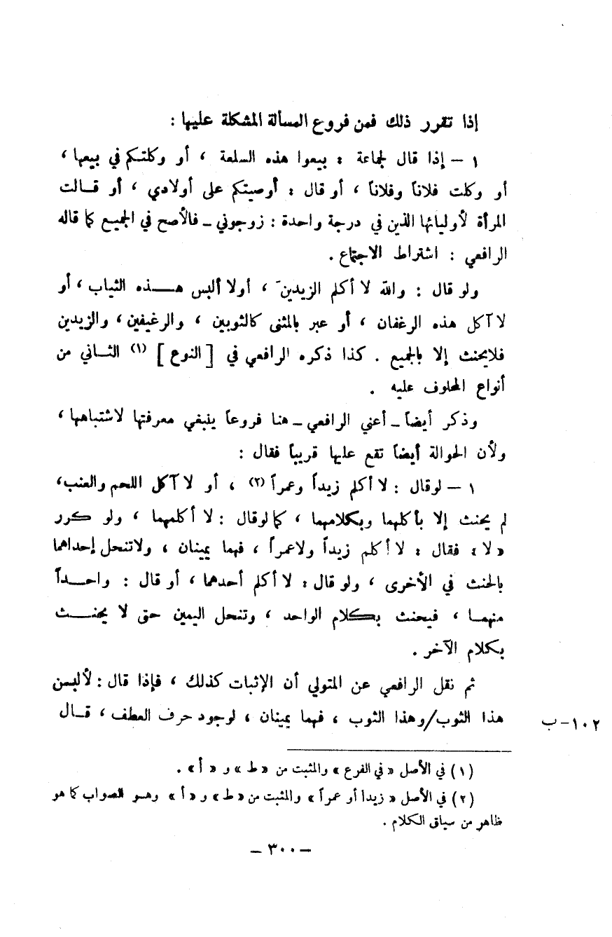 1 - لَو قَالَ لَا اكلم زيدا وعمرا أَو لَا آكل اللَّحْم وَالْعِنَب لم يَحْنَث إِلَّا بأكلهما وبكلامهما كَمَا لَو قَالَ لَا اكلهما وَلَو كرر لَا فَقَالَ لَا أكلم زيدا وَلَا عمرا فهما يمينان وَلَا تنْحَل إِحْدَاهمَا بِالْحِنْثِ فِي الْأُخْرَى وَلَو قَالَ لَا أكلم أَحدهمَا أَو قَالَ وَاحِدًا مِنْهُمَا فَيحنث بِكَلَام الْوَاحِد وتنحل الْيَمين حَتَّى لَا يَحْنَث بِكَلَام الآخر