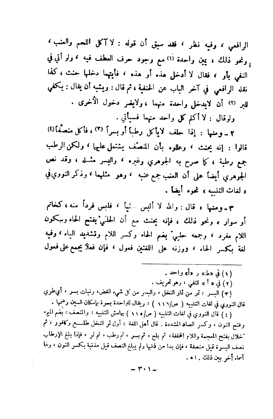 2 - وَمِنْهَا إِذا حلف لَا يَأْكُل رطبا أَو بسرا فَأكل منصفا قَالُوا إِنَّه يَحْنَث وعللوه بِأَن الْمنصف ليشتمل عَلَيْهِمَا وَلَكِن الرطب جمع رطبَة كَمَا صرح بِهِ الْجَوْهَرِي وَغَيره والبسر مثله وَقد نَص الْجَوْهَرِي ايضا على أَن الْعِنَب جمع عنبه وَهُوَ مثلهمَا وَذكر النَّوَوِيّ فِي لُغَات التَّنْبِيه نَحوه ايضا