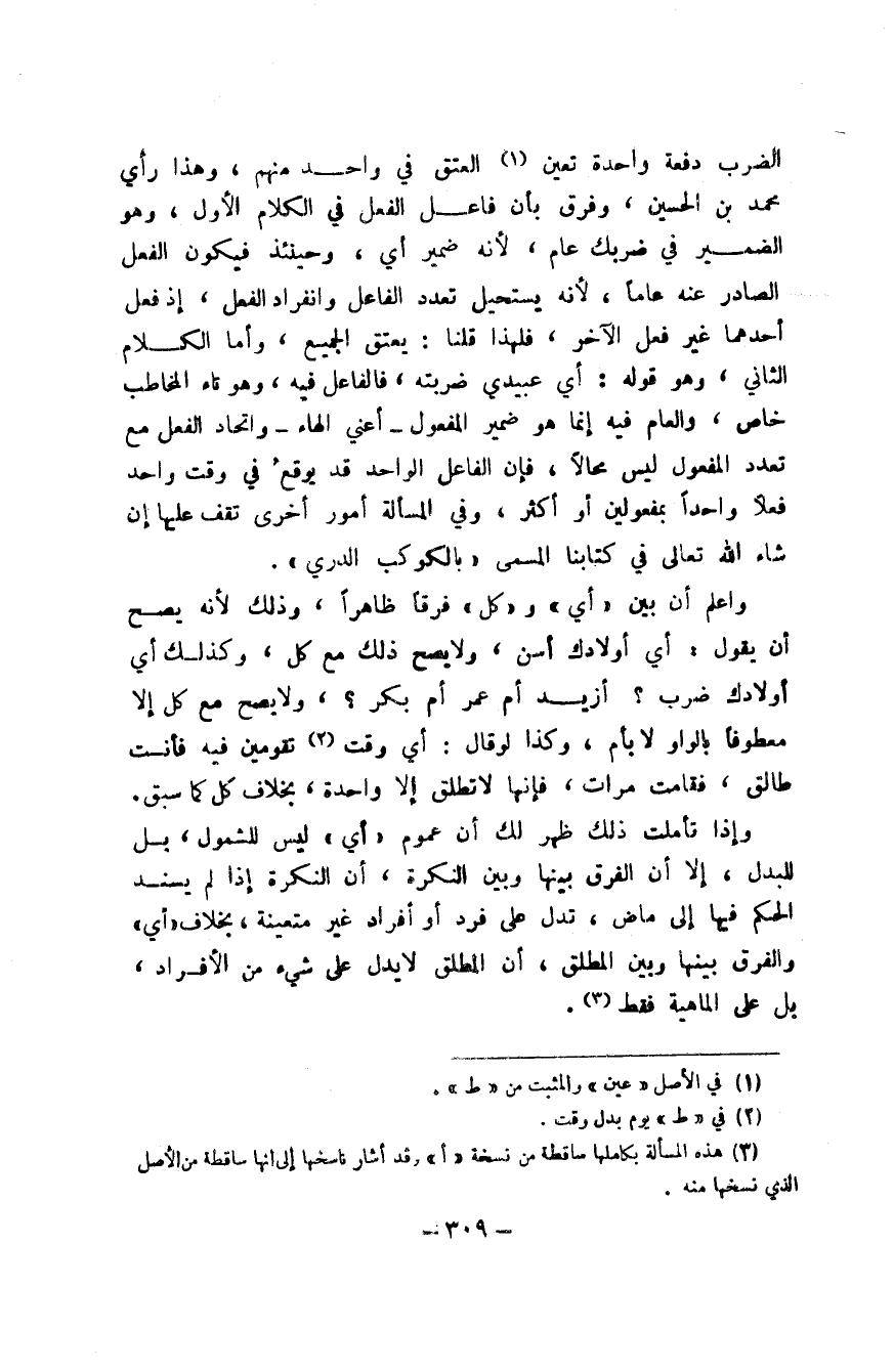الضَّرْب دفْعَة وَاحِدَة تعين الْعتْق فِي وَاحِد مِنْهُم وَهَذَا رَأْي مُحَمَّد بن الْحُسَيْن وَفرق بِأَن فَاعل الْفِعْل فِي الْكَلَام الأول وَهُوَ الضَّمِير فِي ضربك عَام لِأَنَّهُ ضمير أَي وَحِينَئِذٍ فَيكون الْفِعْل الصَّادِر عَنهُ عَاما لِأَنَّهُ يَسْتَحِيل تعدد الْفَاعِل وانفراد الْفِعْل إِذْ فعل أَحدهمَا غير فعل الآخر فَلهَذَا قُلْنَا يعْتق الْجَمِيع وَأما الْكَلَام الثَّانِي وَهُوَ قَوْله أَي عَبِيدِي ضَربته فالفاعل فِيهِ وَهُوَ تَاء الْمُخَاطب خَاص وَالْعَام فِيهِ إِنَّمَا هُوَ ضمير الْمَفْعُول أَعنِي الْهَاء واتحادالفعل مَعَ تعدد الْمَفْعُول لَيْسَ محالا فَإِن الْفَاعِل الْوَاحِد قد يُوقع فِي وَقت وَاحِد فعلا وَاحِدًا بمفعولين أَو أَكثر وَفِي الْمَسْأَلَة أُمُور اخرى تقف عَلَيْهَا إِن شَاءَ الله تَعَالَى فِي كتَابنَا الْمُسَمّى بالكواكب الدُّرِّي