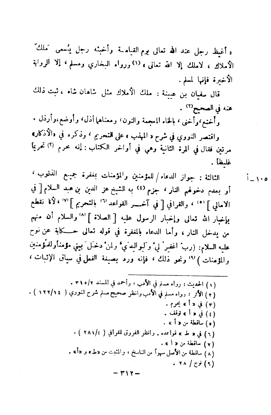 الثَّالِثَة جَوَاز الدُّعَاء للْمُؤْمِنين وَالْمُؤْمِنَات بمغفرة جَمِيع الذُّنُوب أَو بِعَدَمِ دُخُولهمْ النَّار جزم بِهِ الشَّيْخ عز الدّين بن عبد السَّلَام فِي الأمالي والقرافي فِي آخر الْقَوَاعِد بِالتَّحْرِيمِ لأَنا نقطع بِإِخْبَار الله تَعَالَى وإخبار الرَّسُول عَلَيْهِ الصَّلَاة وَالسَّلَام أَن مِنْهُم من يدْخل النَّار وَأما الدُّعَاء بالمغفرة فِي قَوْله تَعَالَى حِكَايَة عَن نوح عَلَيْهِ السَّلَام {رب اغْفِر لي ولوالدي وَلمن دخل بَيْتِي مُؤمنا وَلِلْمُؤْمنِينَ وَالْمُؤْمِنَات} وَنَحْو ذَلِك فَإِنَّهُ ورد بِصِيغَة الْفِعْل فِي سِيَاق الْإِثْبَات
