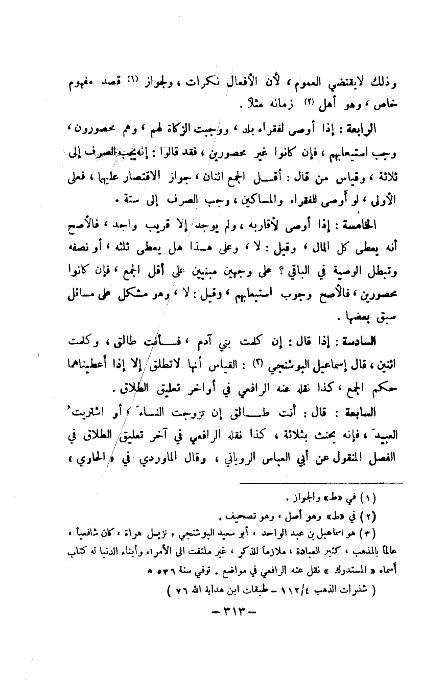 السَّادِسَة إِذا قَالَ إِن كلمت بني آدم فَأَنت طَالِق وَكلمت اثْنَيْنِ قَالَ إِسْمَاعِيل البوشنجي الْقيَاس أَنَّهَا لَا تطلق إِلَّا إِذا اعطيناهما حكم الْجمع كَذَا نَقله عَنهُ الرَّافِعِيّ فِي أَوَاخِر تَعْلِيق الطَّلَاق