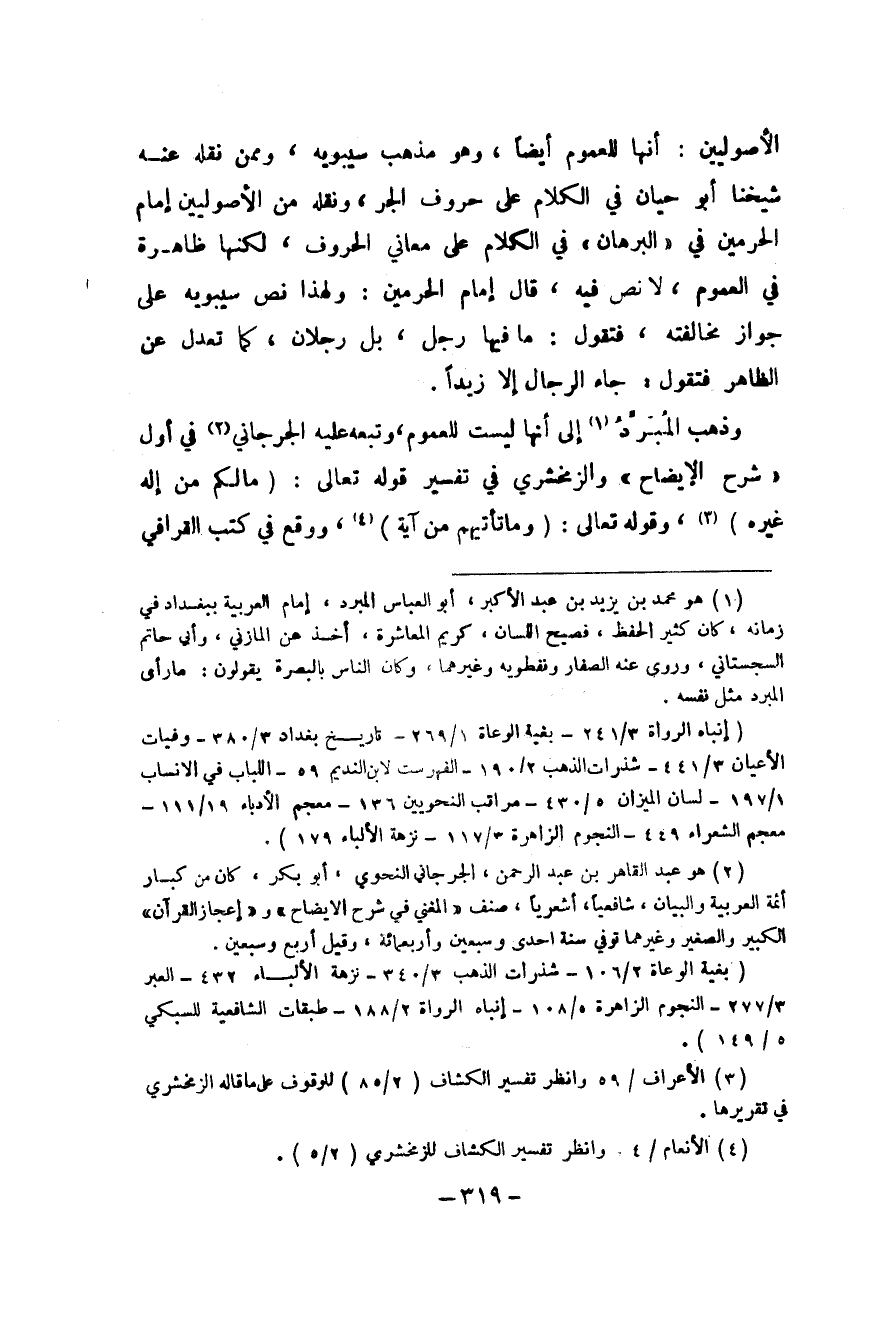 وَذهب الْمبرد إِلَى أَنَّهَا لَيست للْعُمُوم وَتَبعهُ عَلَيْهِ الْجِرْجَانِيّ فِي أول شرح الْإِيضَاح والزمخشري فِي تَفْسِير قَوْله تَعَالَى {مَا لكم من إِلَه غَيره} وَقَوله تَعَالَى {وَمَا تأتيهم من آيَة} وَوَقع فِي كتب الْقَرَافِيّ
