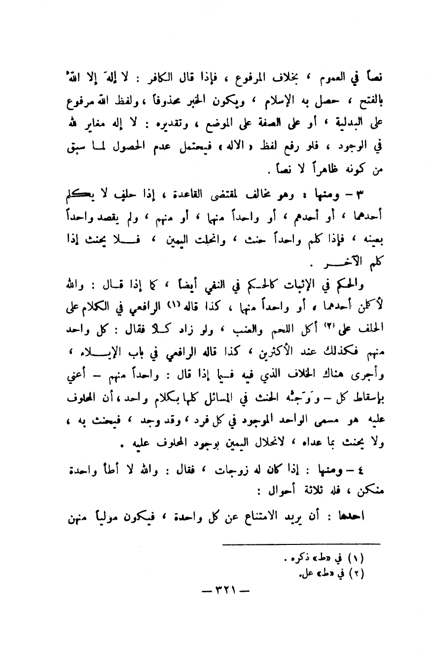 3 - وَمِنْهَا وَهُوَ مُخَالف لمقْتَضى الْقَاعِدَة إِذا حلف لَا يكلم أَحدهمَا أَو أحدهم أَو وَاحِدًا مِنْهُمَا أَو مِنْهُم وَلم يقْصد وَاحِدًا بِعَيْنِه فَإِذا كلم وَاحِدًا حنث وانحلت الْيَمين فَلَا يَحْنَث إِذا كلم الآخر
