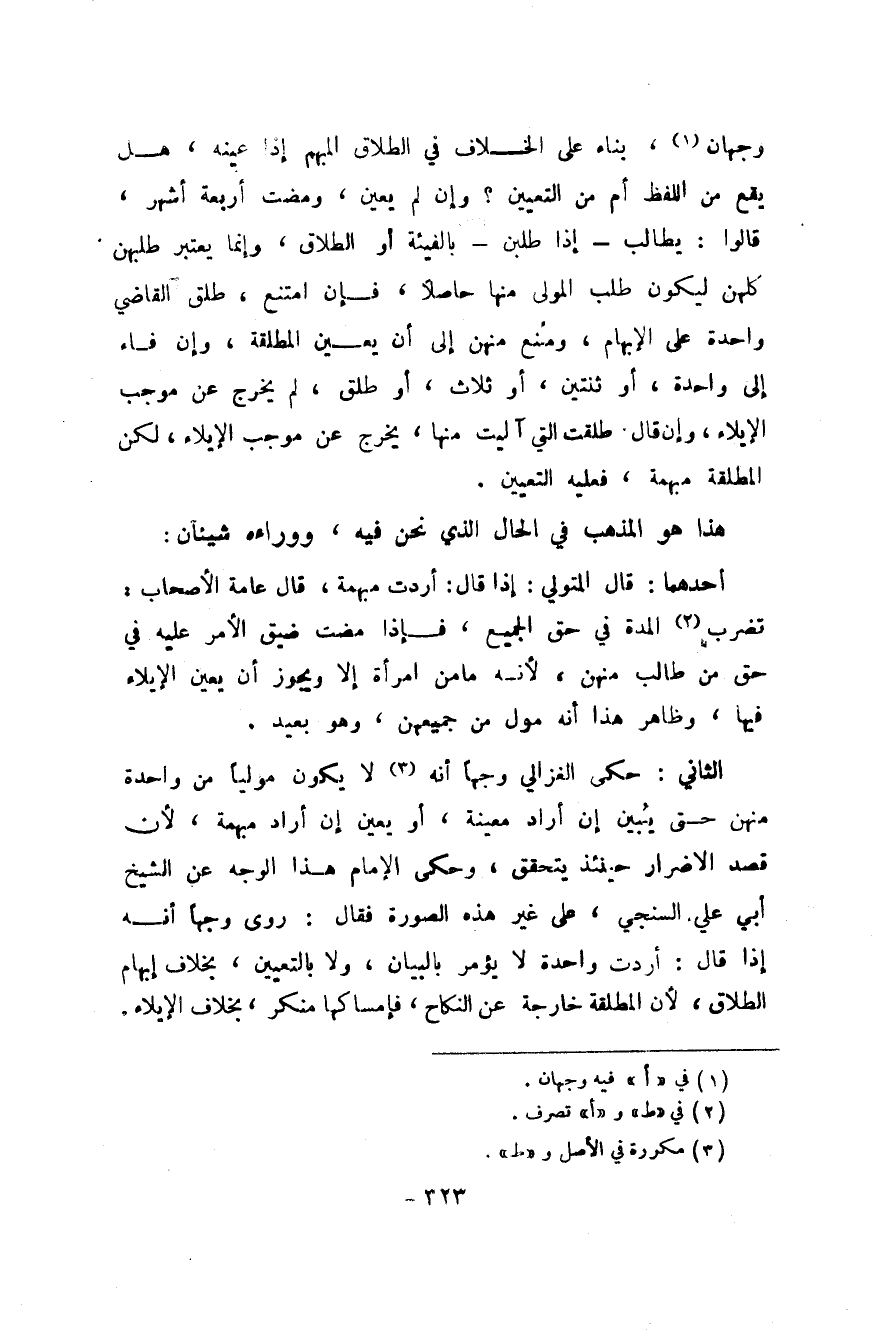 الثَّانِي حكى الْغَزالِيّ وَجها أَنه لَا يكون موليا من وَاحِدَة مِنْهُنَّ حَتَّى يبين إِن أَرَادَ مُعينَة أَو يعين إِن أَرَادَ مُبْهمَة لِأَن قصَّة الاضرار حِينَئِذٍ يتَحَقَّق وَحكى الإِمَام هَذَا الْوَجْه عَن الشَّيْخ أبي عَليّ السنجي على غير هَذِه الصُّورَة فَقَالَ روى وَجها أَنه إِذا قَالَ أردْت وَاحِدَة لَا يُؤمر بِالْبَيَانِ وَلَا بِالتَّعْيِينِ بِخِلَاف إِبْهَام الطَّلَاق لِأَن الْمُطلقَة خَارِجَة عَن النِّكَاح فامساكها مُنكر بِخِلَاف الْإِيلَاء