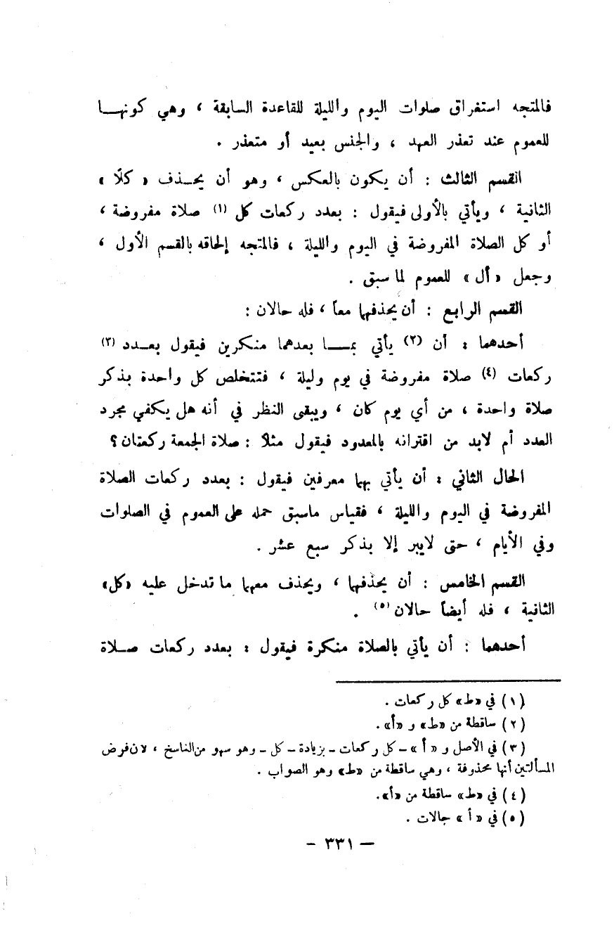 الْقسم الثَّالِث أَن يكون بِالْعَكْسِ وَهُوَ أَن يحذف كلا الثَّانِيَة وَيَأْتِي يالأولى فَيَقُول بِعَدَد رَكْعَات كل صَلَاة مَفْرُوضَة أَو كل الصَّلَاة الْمَفْرُوضَة فِي الْيَوْم وَاللَّيْلَة فَالْمُتَّجه إِلْحَاقه بالقسم الأول وَجعل أل للْعُمُوم لما سبق