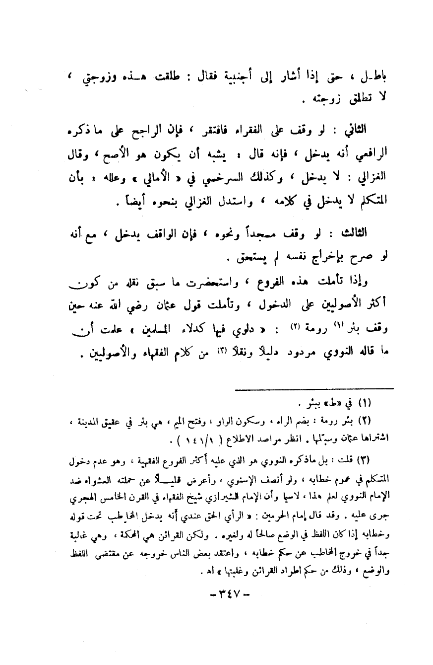 وَإِذا تَأَمَّلت هَذِه الْفُرُوع واستحضرت مَا سبق نَقله من كَون اكثر الْأُصُولِيِّينَ على الدُّخُول وتاملت قَول عُثْمَان رَضِي الله عَنهُ حِين وقف بِئْرا رومة دلوي فِيهَا كدلاء الْمُسلمين علمت أَن مَا قَالَه النَّوَوِيّ مَرْدُود دَلِيلا ونقلا من كَلَام الْفُقَهَاء والأصوليين