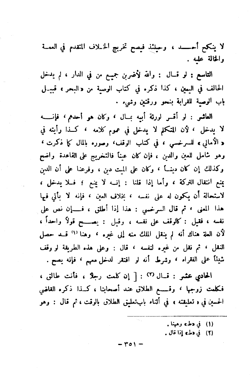 الْعَاشِر لَو أقرّ لوَرَثَة أَبِيه بِمَال وَكَانَ هُوَ أحدهم فَإِنَّهُ لَا يدْخل لِأَن الْمُتَكَلّم لَا يدْخل فِي عُمُوم كَلَامه كَذَا رَأَيْته فِي الأمالي للسرخسي فِي كتاب الْوَقْف وصوره بِالْمَالِ كَمَا ذكرت وَهُوَ شَامِل للعين وَالدّين فَإِن كَانَ عينا فالتخريج على الْقَاعِدَة وَاضح وَكَذَلِكَ إِن كَانَ دينا وَكَانَ على الْمَيِّت دين وفرعنا على أَن الدّين يمْنَع انْتِقَال التَّرِكَة وَأما إِذا قُلْنَا إِنَّه لَا يمْنَع فَلَا يدْخل لِاسْتِحَالَة أَن يكون لَهُ على نَفسه بِخِلَاف الْعين فَإِنَّهُ لَا يَأْتِي فِيهَا هَذَا الْمَعْنى ثمَّ قَالَ السَّرخسِيّ هَذَا إِذا طلق فَإِن نَص على نَفسه فَقيل كالوقف على نَفسه وَقيل يَصح قولا وَاحِدًا لِأَن الْعلَّة هُنَاكَ أَنه لم ينْقل الْملك مِنْهُ إِلَى غَيره وَهنا قد حصل النَّقْل ثمَّ نقل من غَيره لنَفسِهِ قَالَ وعَلى هَذِه الطَّرِيقَة لَو وقف شَيْئا على الْفُقَرَاء وَشرط أَنه لَو افْتقر لدخل مَعَهم فَإِنَّهُ يَصح