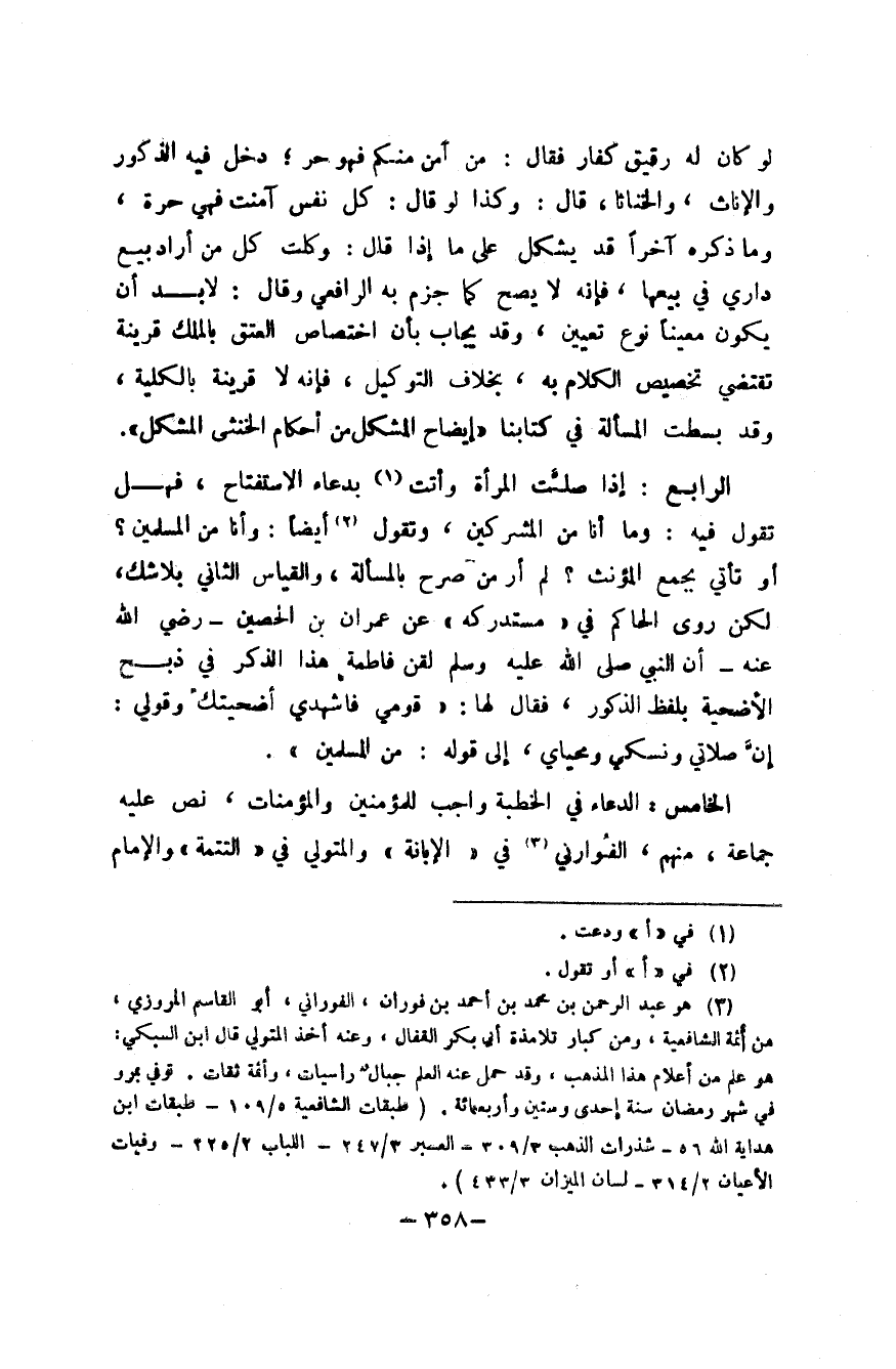 الرَّابِع إِذا صلت الْمَرْأَة وَأَتَتْ بِدُعَاء الاستفتاح فَهَل تَقول فِيهِ وَمَا أَنا من الْمُشْركين وَتقول أَيْضا وَأَنا من الْمُسلمين أَو تَأتي بِجمع الْمُؤَنَّث لم أر من صرح بِالْمَسْأَلَة وَالْقِيَاس الثَّانِي بِلَا شكّ لَكِن روى الْحَاكِم فِي مُسْتَدْركه عَن عمرَان بن الْحصين رَضِي الله عَنهُ أَن النَّبِي صلى الله عَلَيْهِ وَسلم لقن فَاطِمَة هَذَا الذّكر فِي ذبح الْأُضْحِية بِلَفْظ الذُّكُور فَقَالَ لَهَا قومِي فاشهدي أضحيتك وَقَوْلِي إِن صَلَاتي ونسكي ومحياي إِلَى قَوْله من الْمُسلمين