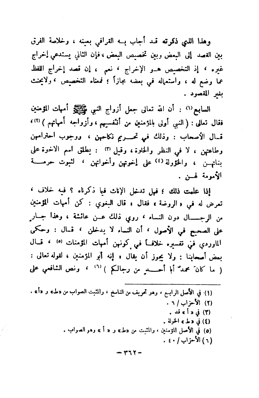 السَّابِع أَن الله تَعَالَى جعل أَزوَاج النَّبِي صلى الله عَلَيْهِ وَسلم أُمَّهَات الْمُؤمنِينَ فَقَالَ تَعَالَى {النَّبِي أولى بِالْمُؤْمِنِينَ من أنفسهم وأزواجه أمهاتهم} قَالَ الْأَصْحَاب وَذَلِكَ فِي تَحْرِيم نِكَاحهنَّ وَوُجُوب احترامهن وطاعتهن لَا فِي النّظر وَالْخلْوَة وَقيل يُطلق اسْم الاخوة على بناتهن والخؤولة على إخوتهن وأخواتهن لثُبُوت حُرْمَة الأمومة لَهُنَّ