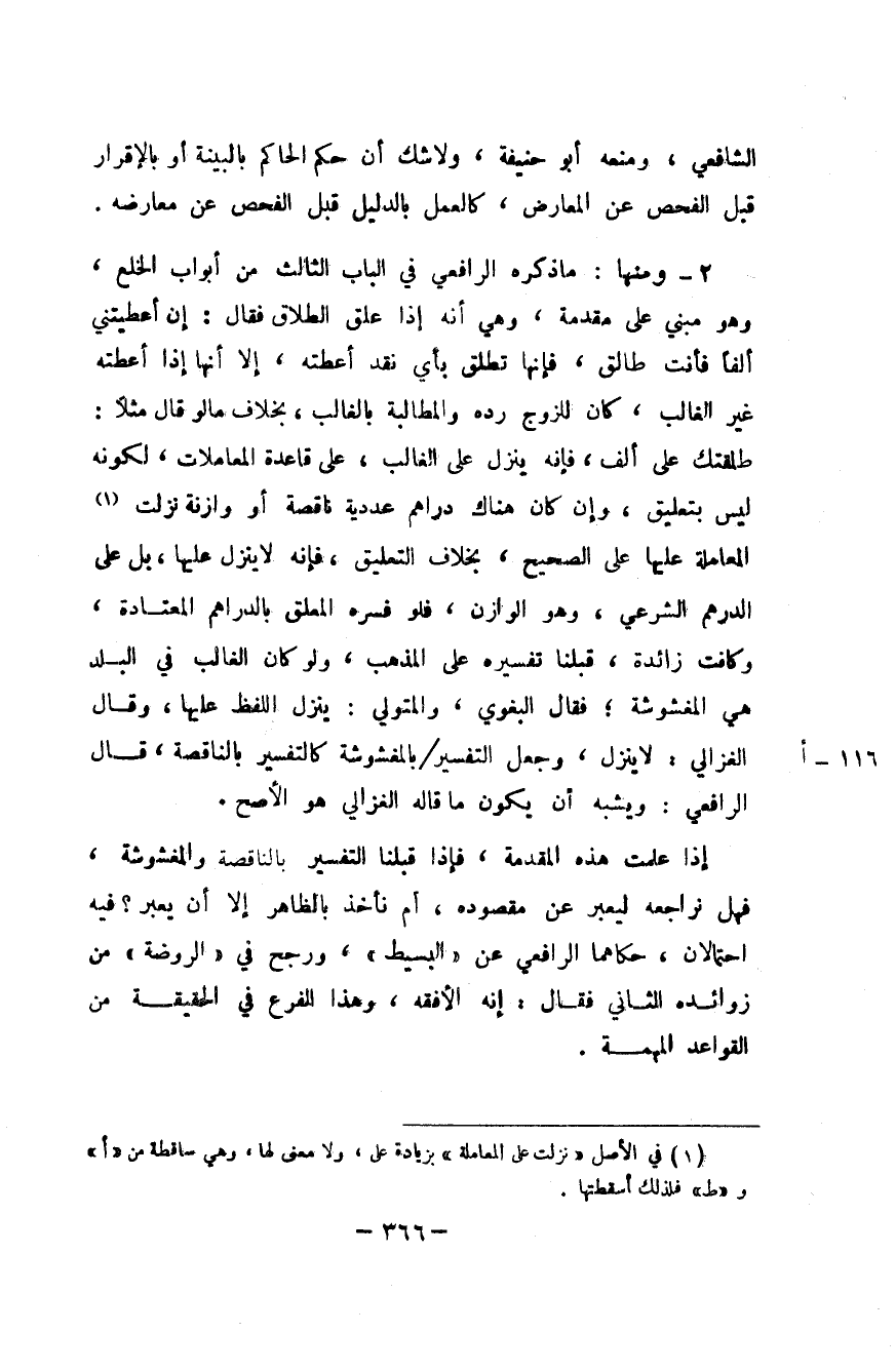 2 - وَمِنْهَا مَا ذكره الرَّافِعِيّ فِي الْبَاب الثَّالِث من أَبْوَاب الْخلْع وَهُوَ مَبْنِيّ على مُقَدّمَة وَهِي أَنه إِذا علق الطَّلَاق فَقَالَ إِن اعطيتني ألفا فَأَنت طَالِق فَإِنَّهَا تطلق بِأَيّ نقد أَعْطيته إِلَّا انها إِذا أَعطَتْهُ غير الْغَالِب كَانَ للزَّوْج رده والمطالبة بالغالب بِخِلَاف مالو قَالَ مثلا طَلقتك على الف فَإِنَّهُ ينزل على الْغَالِب على قَاعِدَة الْمُعَامَلَات لكَونه لَيْسَ بتعليق وَإِن كَانَ هُنَاكَ دَرَاهِم عددية نَاقِصَة أَو وازنة نزلت الْمُعَامَلَة عَلَيْهَا على الصَّحِيح بِخِلَاف التَّعْلِيق فَإِنَّهُ لَا ينزل عَلَيْهَا بل على الدِّرْهَم الشَّرْعِيّ وَهُوَ الوازن فَلَو فسره الْمُعَلق بِالدَّرَاهِمِ الْمُعْتَادَة وَكَانَت زَائِدَة قبلنَا تَفْسِيره على الْمَذْهَب وَلَو كَانَ الْغَالِب فِي الْبَلَد هِيَ المغشوشة فَقَالَ الْبَغَوِيّ وَالْمُتوَلِّيّ ينزل اللَّفْظ عَلَيْهَا وَقَالَ الْغَزالِيّ لَا ينزل وَجعل التَّفْسِير بالمغشوشة كالتفسير بالناقصة قَالَ الرَّافِعِيّ وَيُشبه أَن يكون مَا قَالَه الْغَزالِيّ هُوَ الْأَصَح