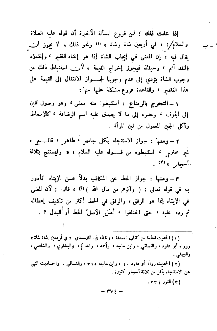 2 - وَمِنْهَا جَوَاز الِاسْتِنْجَاء بِكُل جامد طَاهِر قالع غير مُحْتَرم استنبطوه من قَوْله عَلَيْهِ السَّلَام وليستنج بِثَلَاثَة احجار