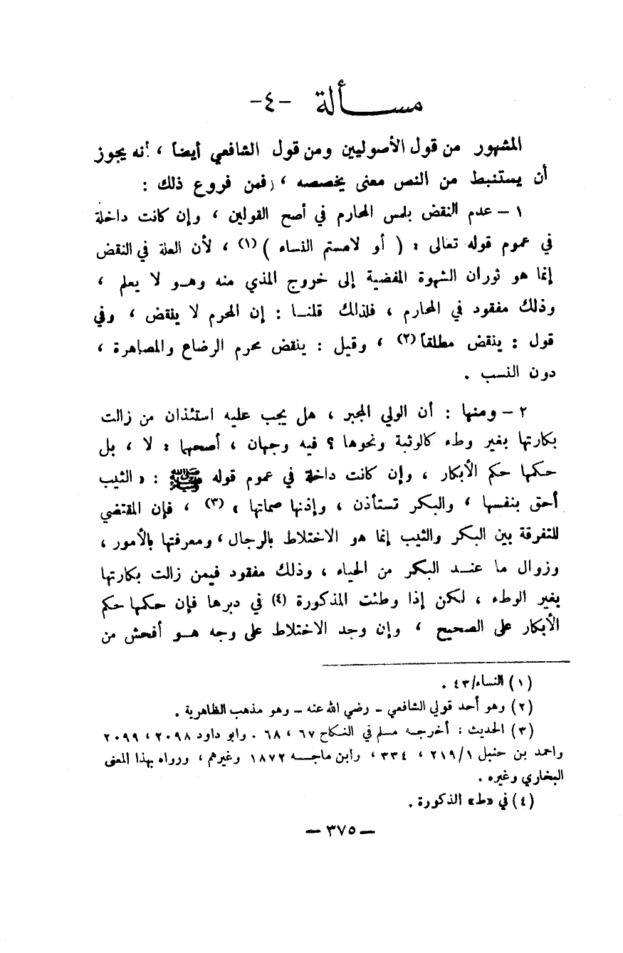 1 - عدم النَّقْض بلمس الْمَحَارِم فِي أصح الْقَوْلَيْنِ وَإِن كَانَت دَاخِلَة فِي عُمُوم قَوْله تَعَالَى {أَو لامستم النِّسَاء} لِأَن الْعلَّة فِي النَّقْض إِنَّمَا هُوَ ثوران الشَّهْوَة المفضية إِلَى خُرُوج الْمَذْي مِنْهُ وَهُوَ لَا يعلم وَذَلِكَ مَفْقُود فِي الْمَحَارِم فَلذَلِك قُلْنَا إِن الْمحرم لَا ينْقض وَفِي قَول ينْقض مُطلقًا وَقيل ينْقض محرم الرَّضَاع والمصاهرة دون النّسَب