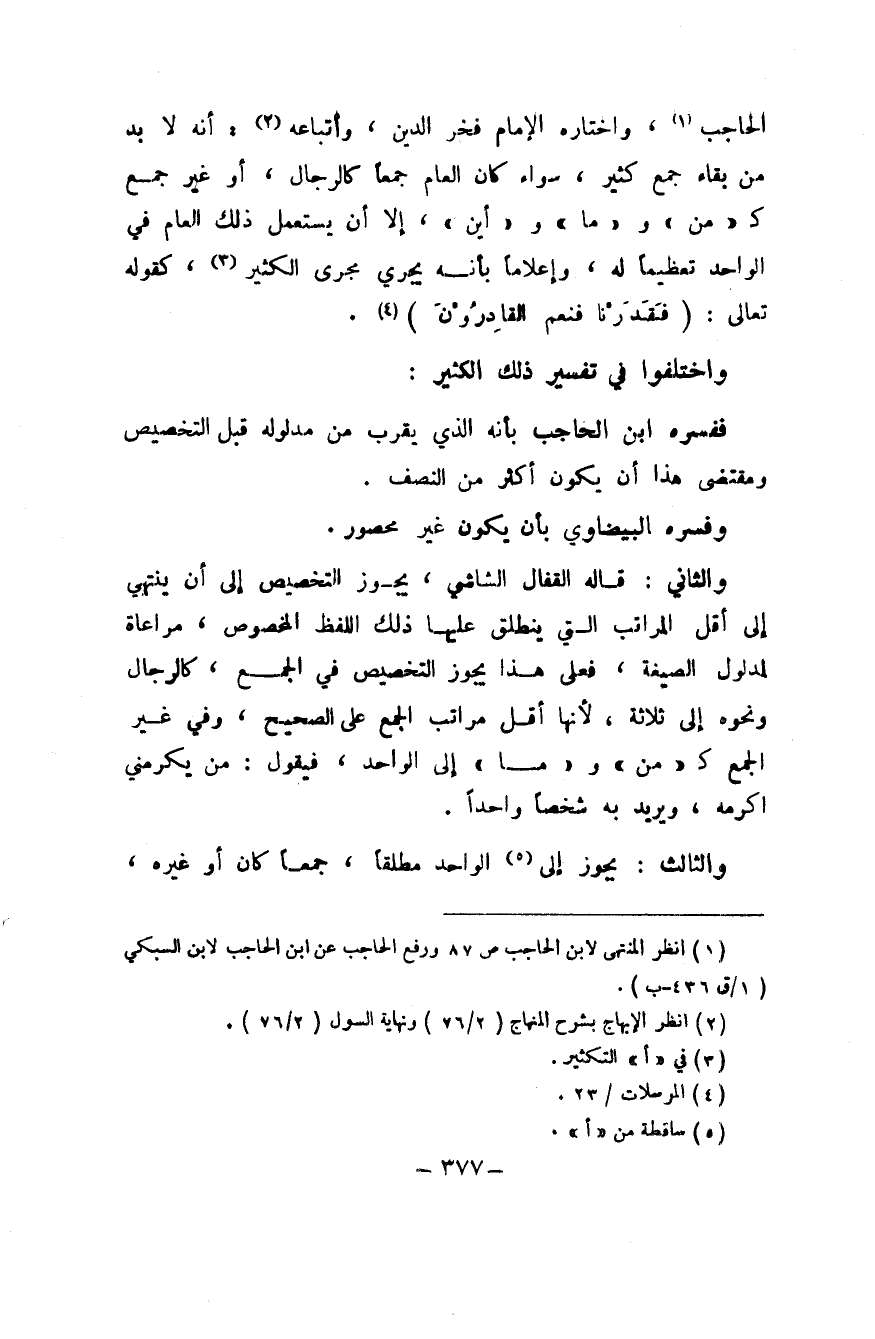 الْحَاجِب وَاخْتَارَهُ الإِمَام فَخر الدّين وَأَتْبَاعه أَنه لَا بُد من بَقَاء جمع كثير سَوَاء كَانَ الْعَام جمعا كالرجال أَو غير جمع ك من وَمَا وَأَيْنَ إِلَّا أَن يسْتَعْمل ذَلِك الْعَام فِي الْوَاحِد تَعْظِيمًا لَهُ وإعلاما بِأَنَّهُ يجْرِي مجْرى الْكثير كَقَوْلِه تَعَالَى {فقدرنا فَنعم القادرون}