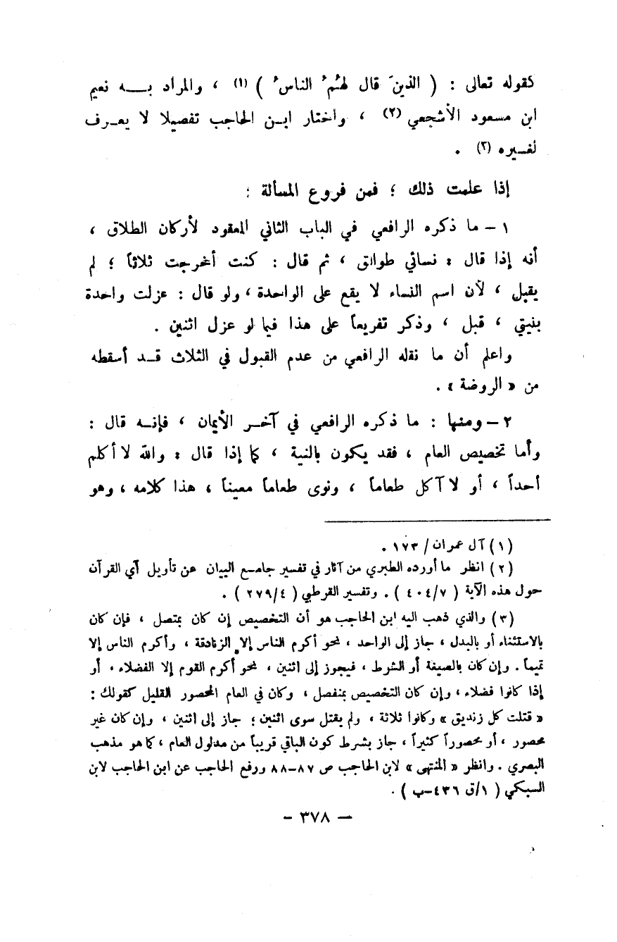 2 - وَمِنْهَا مَا ذكره الرَّافِعِيّ فِي آخر الْأَيْمَان فَإِنَّهُ قَالَ واما تَخْصِيص الْعَام فقد يكون بِالنِّيَّةِ كَمَا إِذا قَالَ وَالله لَا أكلم أحدا أَو لَا آكل طَعَاما وَنوى طَعَاما معينا هَذَا كَلَامه وَهُوَ